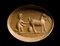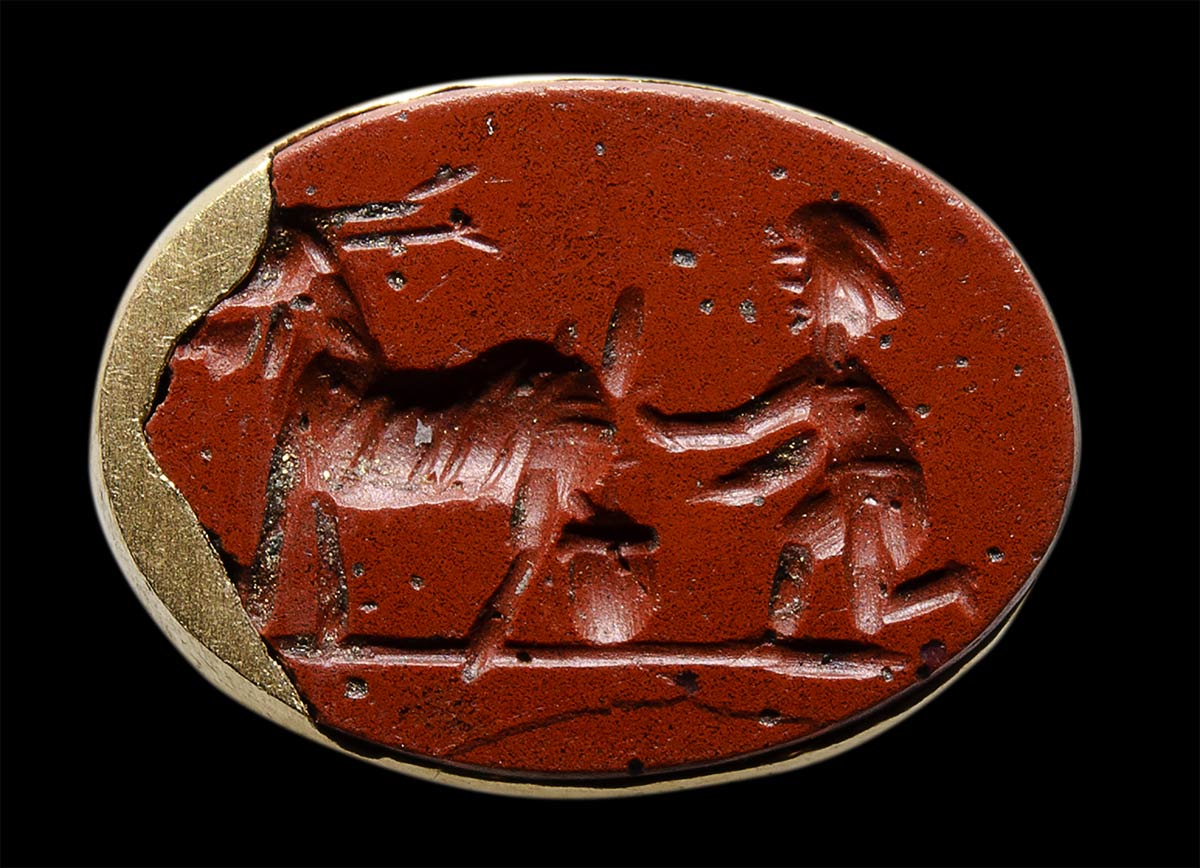 A roman red jasper intaglio set in a modern gold mounting. Shepherd and goat.