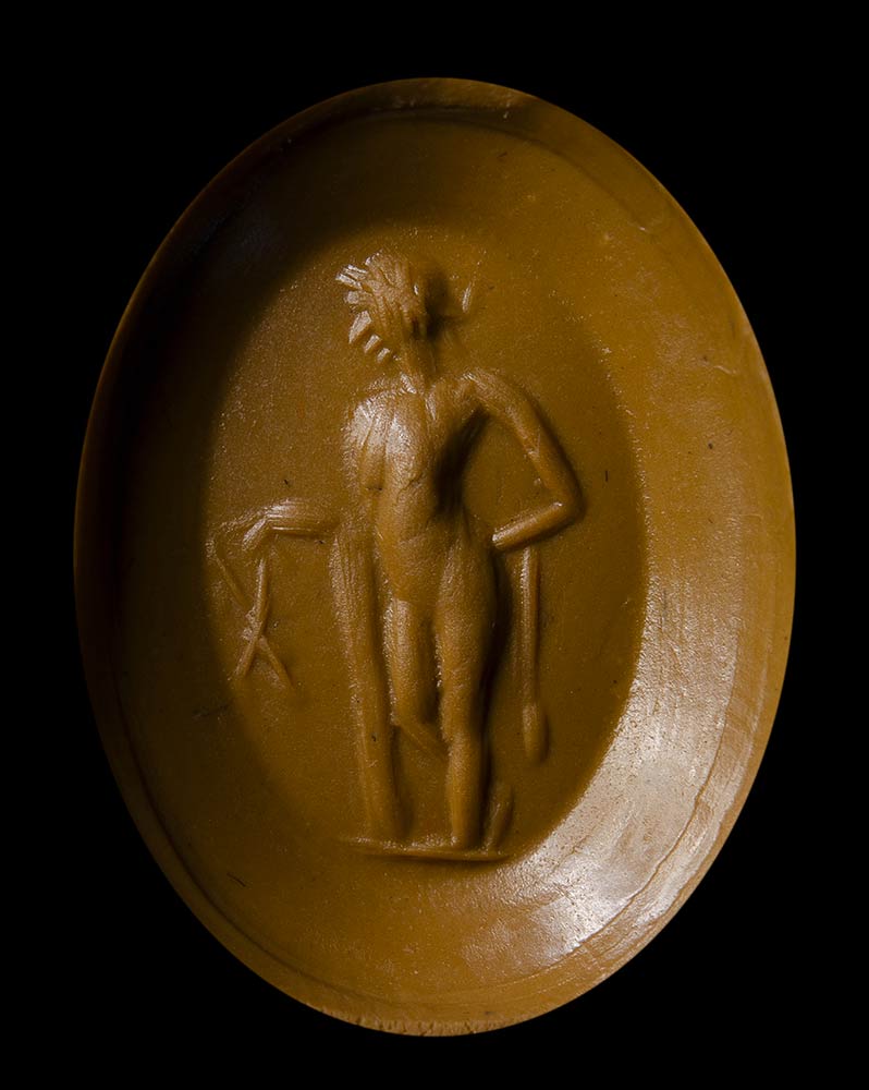 The naked god is standing in a contrapposto, facing right. His left leg slightly bent and crossed behind his right one. He wears a long cloak held by his arms. The left hand holding a laurel branch(?). Laureated head. Groundline.