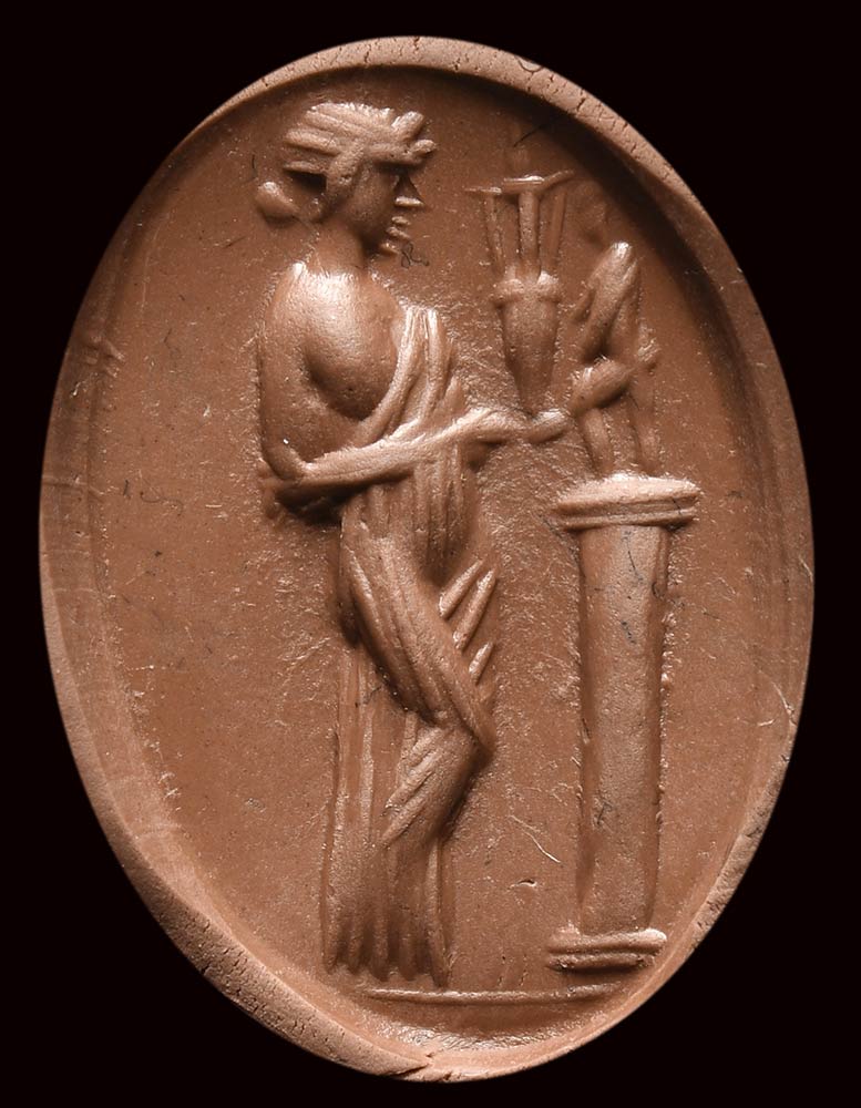 The standing and draped female figure is turned to the left. With both hands, she offers a small amphora to an idol on top of a column. Votive scene. Slight wear marks.