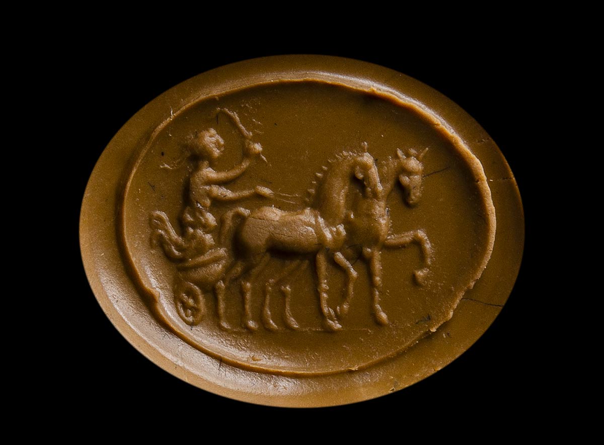 Ring with hoop rounded without and within and surmounted with a large oval bezel set with an intaglio showing a biga. The scene shows a female character ridding a biga and facing left. Groundline.