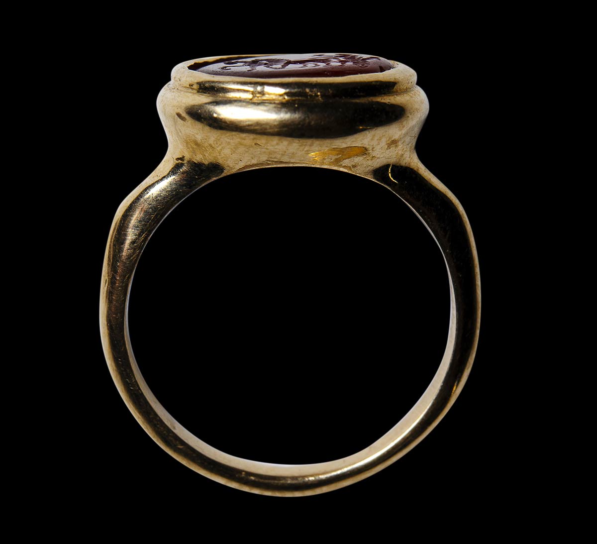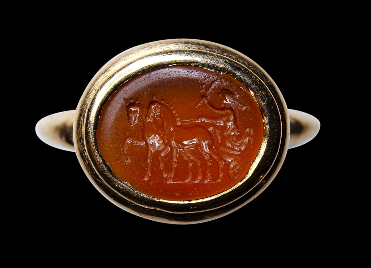 A roman carnelian intaglio mounted in a modern gold ring. Biga.