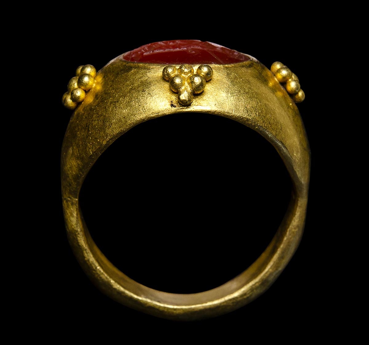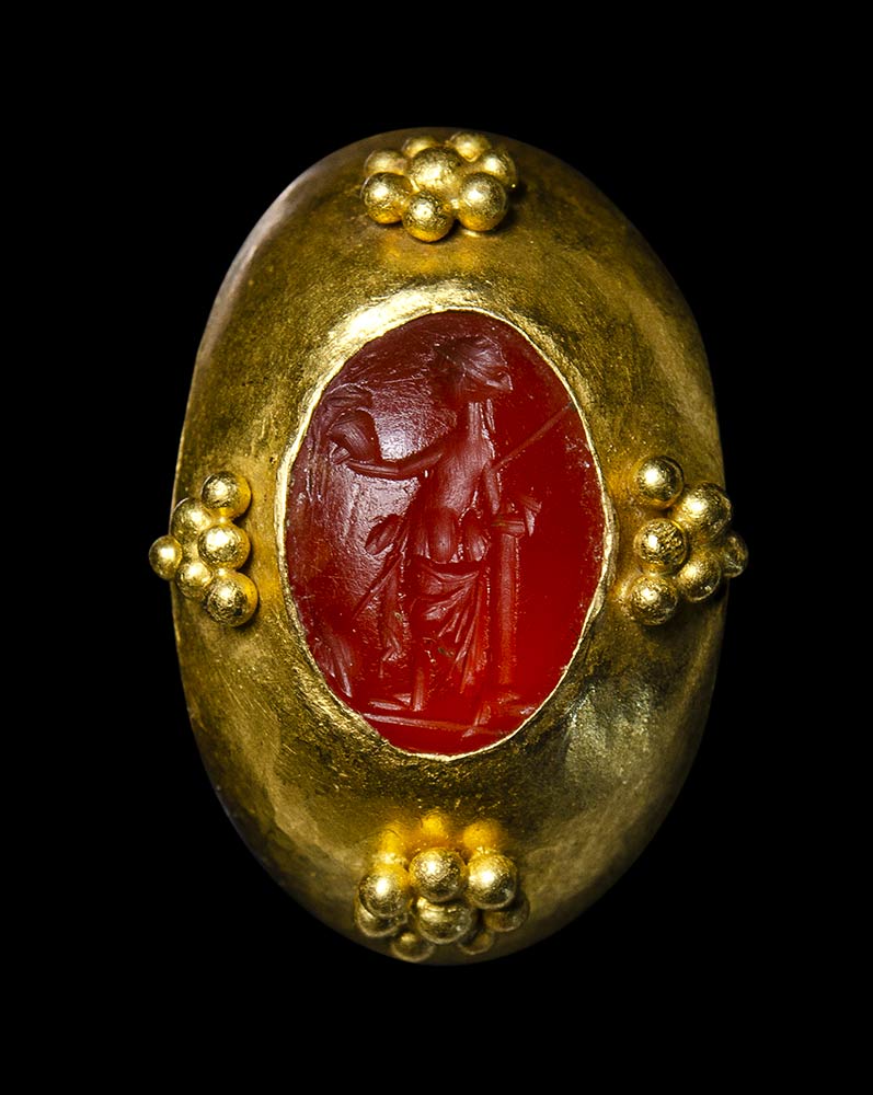 Ring rounded without and flatten within adorned on the shoulders and around the bezel of small gold spherical beads. The intaglio depicts Venus Victrix standing and facing left with her attributes. The stone is set in a later ancient gold mounting (late roman). Rare.