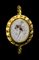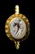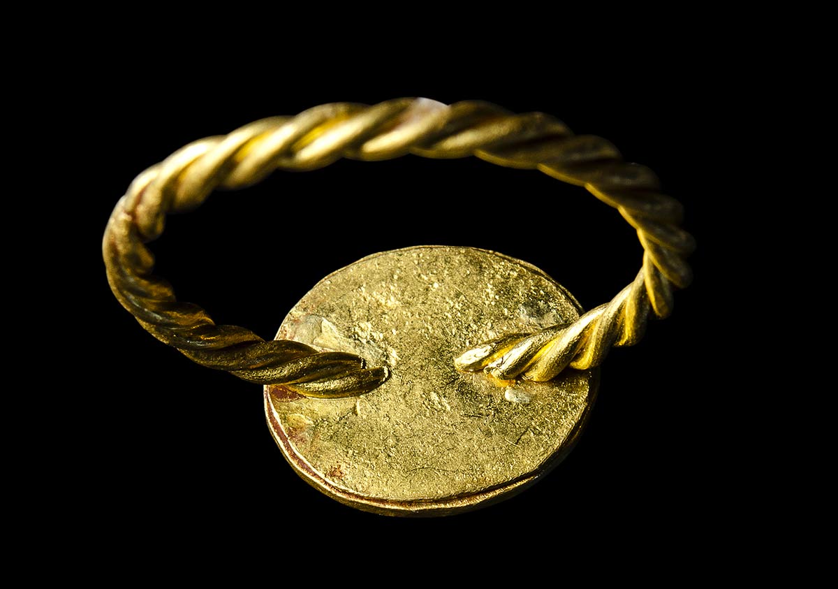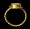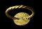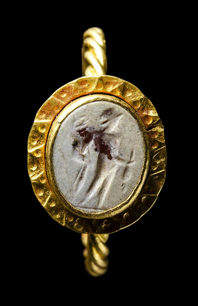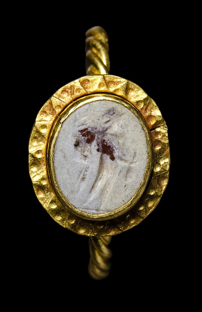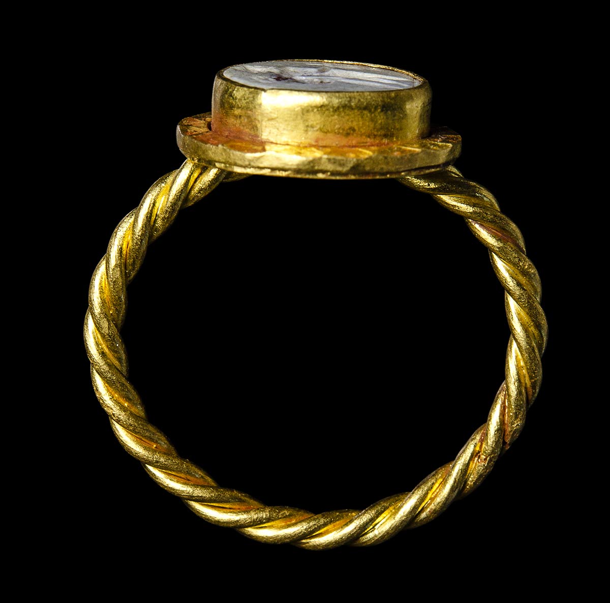 Hoop made of a large plain twisted wire and surmounted by an oval bezel framed with a platted gold plaque embossed with triangular and dotted pattern. In the center a roman intaglio depicting Mercury, standing and facing right. Groundline. Rare.