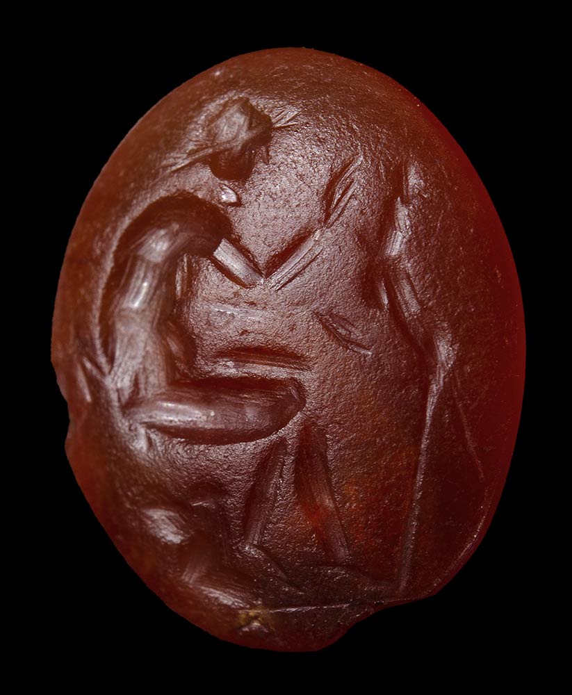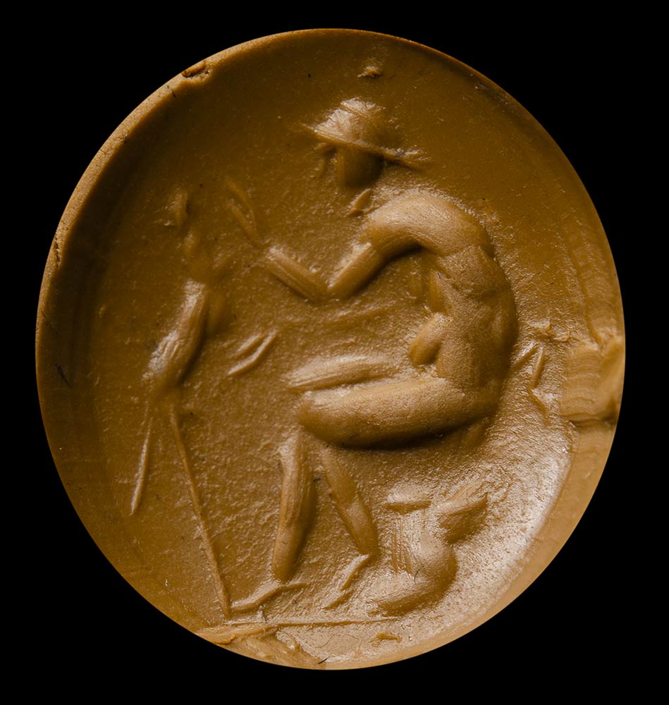 The scene depicts a male character seated facing right intercessing with an hermaic idole in front of him. The presence of a tail behind the character suggests that he is a satyre. Groundline. Small chips on the edge.