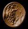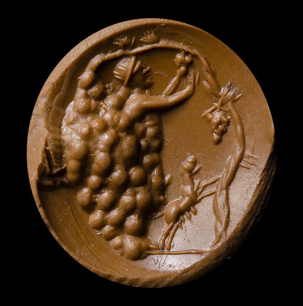 A male character, facing left, is depicted in the act of picking a bunch of grapes from the plant. This plant, characterized by leaves and bunches, ends in a gigantic bunch, from which the character surprisingly emerges. Below, a quadruped standing on the plant, presumably a dog or a feline (panther, symbol of Dionysios ?). This unusual scene is apparently unique, probably referable to the Metamorphoses and the Dionysian context of intoxication and abundance. The stone is characterized by a vivid and luminous color. Very deep carved, despite its small size. Slight signs of wear. Very rare subject.