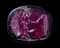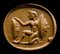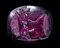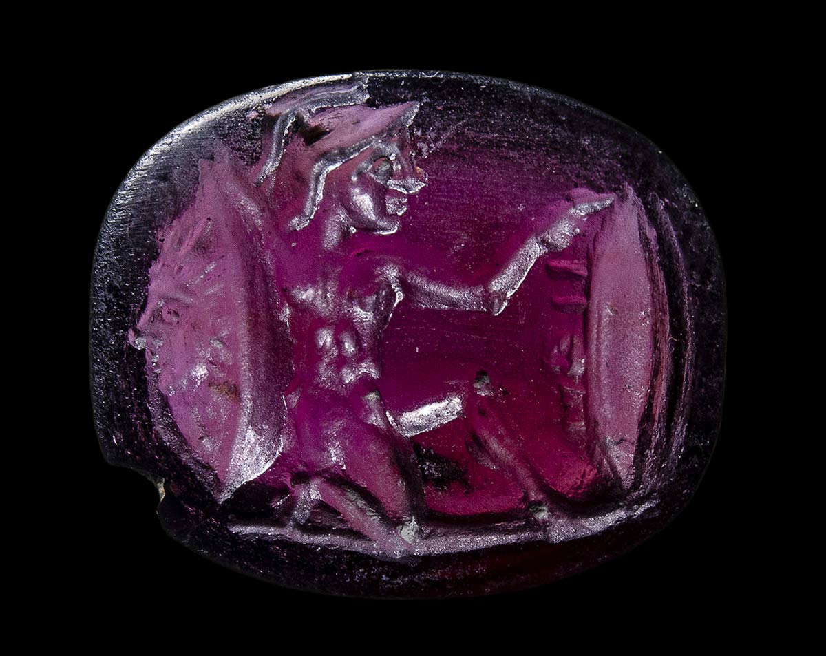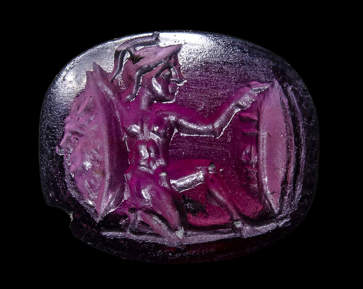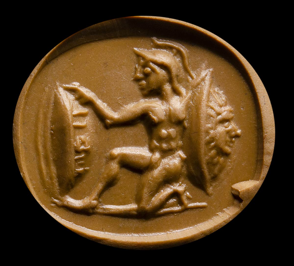 The helmeted soldier faces right, one knee resting on the ground. The character holds two shields, in a pose that recalls the iconography of the Dying Otriade, typical of italic glyptic. Above, a shield with a Gorgone’s mask, apotropaic value. Groundline. Presence of small globular elements. Signs of wear. Attractive stone color.