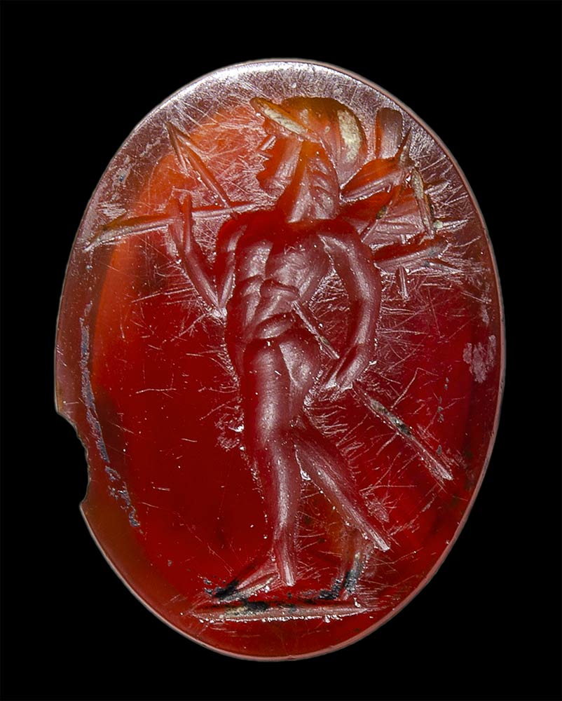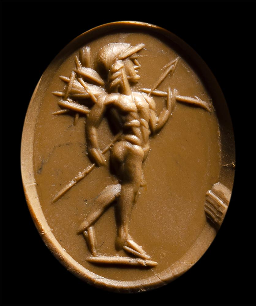 The god of war is moving left carrying a trophy on his shoulders and holding a spear in his hands. Groundline. Nice execution of the figure. Slight chip on the edge. Slight wear marks.
