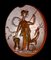 The goddess is standing facing right. She wears a long chiton and holds an arrow with her right hand meanwhile her right arm is leaning on a plinth. At her feet, a deer looking toward her. Groundline. Small chip on the edge. Wear marks on the surface of the stone.