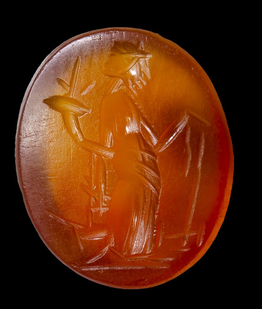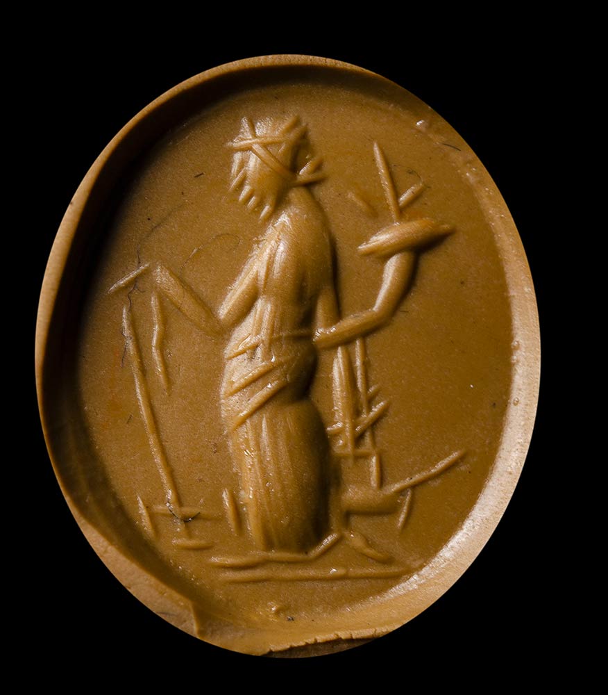 The goddess is standing, turned to the right. In her right hand she holds the cornucopia and the rudder. Groundline.