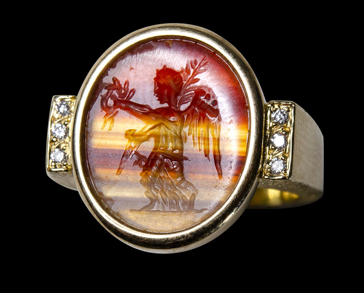 A roman banded agate intaglio mounted on a modern gold ring set with brillants. Winged Victory.