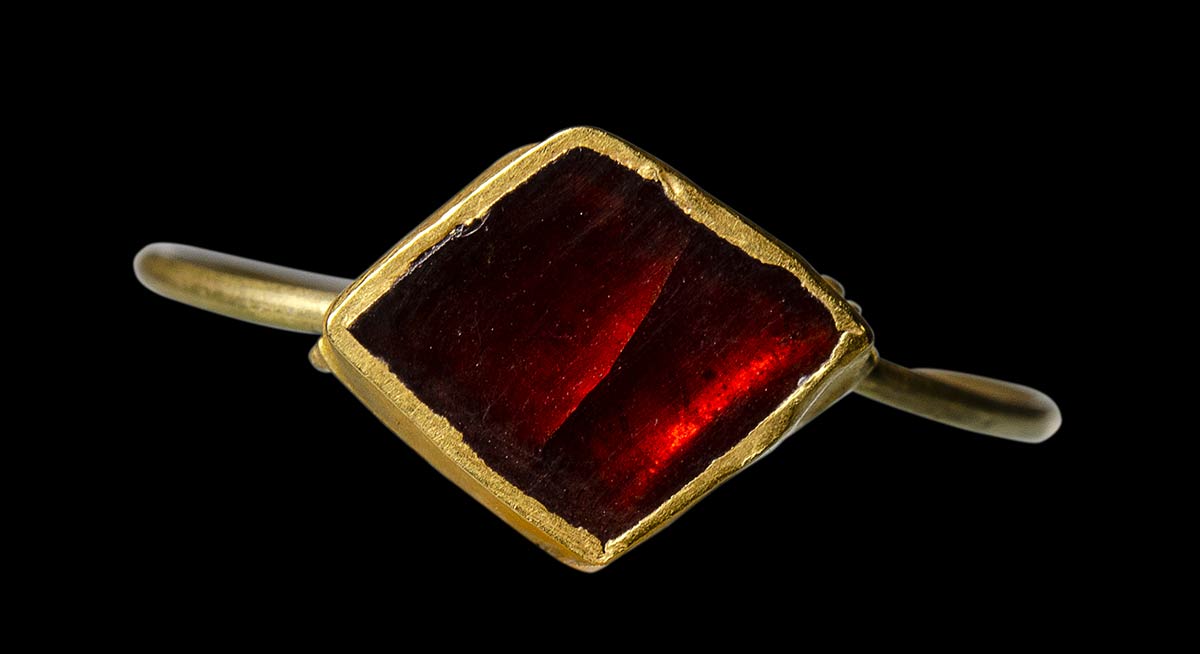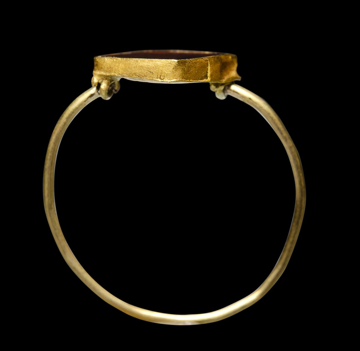 Thin hoop made of a single gold wire and surmonted by a diamond-shaped gold box set with a thin garnet.