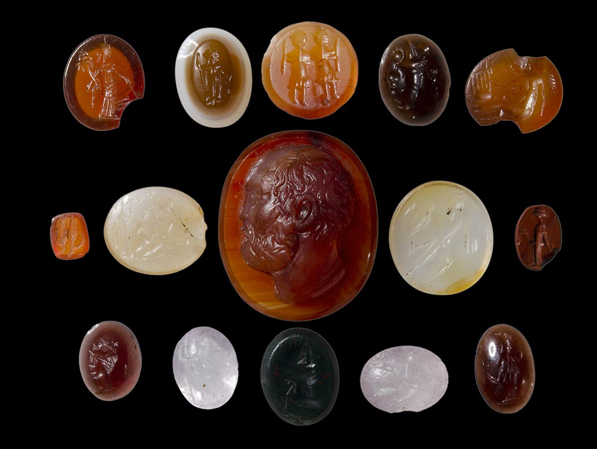 The group is composed of agate, carnelian, heliotrope, amethyst, red jasper, and chalcedony specimen. The subjects including Tyche, Dionysus, Gemini, a cornucopia, eros with lyre, two ears of corn, a satyr with panther, a bust of philosopher, a warrior, an offerer, a male head, Dionysos, male bust, clasped hands with allegorical emblema, an offerer. Mainly roman period and two postclassical stones.