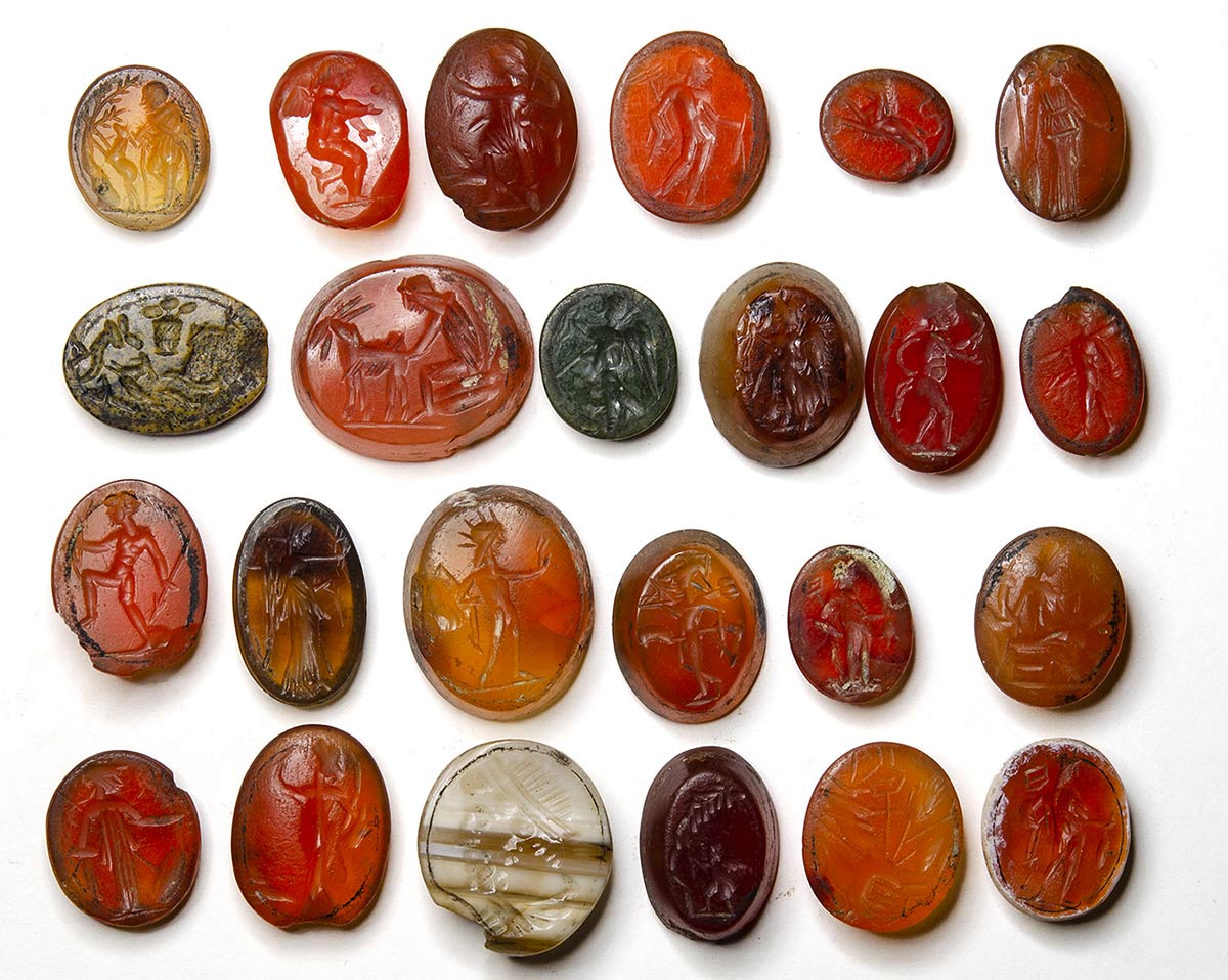 - A roman carnelian intaglio. Pastor with a goat and tree. Groundline.-B205 A roman carnelian intaglio. Winged eros playing with a ball. - A roman carnelian intaglio. Diane hunting. Groundline. Chip and wear marks. - A roman carnelian intaglio. Mercury standing, facing right. Chip and wear marks. - A roman carnelian intaglio. Roaring lion facing left. Small chip and wear marks. - A roman carnelian intaglio. Minerva standing and facing right. - A roman yellow and black dotted jasper. Good fortune symbols. Chip on the edge. - A roman carnelian intaglio. Pastoral scene. Groundline. - A roman jasper intaglio. Winged Victory. - A roman agate intaglio. Winged Victory. - A roman carnelian intaglio. Naked Silenus standing and facing left. Groundline. - A roman carnelian intaglio. Minerva standing and facing left. - A postclassical carnelian intaglio. Naked man standing and facing left holding bow and arrow. Groundline. - A roman agate intaglio. Winged Victory standing and facing right. She holds a laurel wreath. - A roman carnelian intaglio. Standing Apollo, facing right. Groundline. - A roman carnelian intgalio. Mars with attributes standing and facing left. Groundline. - A roman carnelian intaglio. Mercury with his attributes, standing and facing right. - A roman agate carnelian intaglio. Seated Tyche with cornucopia, and a star. Groundline. - A roman carnelian intaglio. Minerva standing and facing right. Groundline. - A roman carnelian intaglio. Dancing maenade. Chip on the edge. Wear marks. - A postclassical banded agate. Portrait of an hellenistic emperor. Chip on the edge. - A roman carnelian intaglio. Eros picking fruit on a tree. Groundline. - A roman carnelian intaglio. Hand holding attributes ; caduceus, cornucopia, ear of corn. - A roman carnelian intaglio. Mercury with attributes standing and facing right. Groundline.