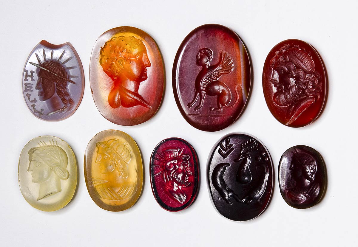 Portrait of Helios with radiated crown and letters « HELIX »; male bust facing right; winged sphinx facing left; bust of a greek ruler; portrait of Ceres; bust of a young man; bust of Jupiter-Ammon; a deer protome with symbols; bust of a ruler.