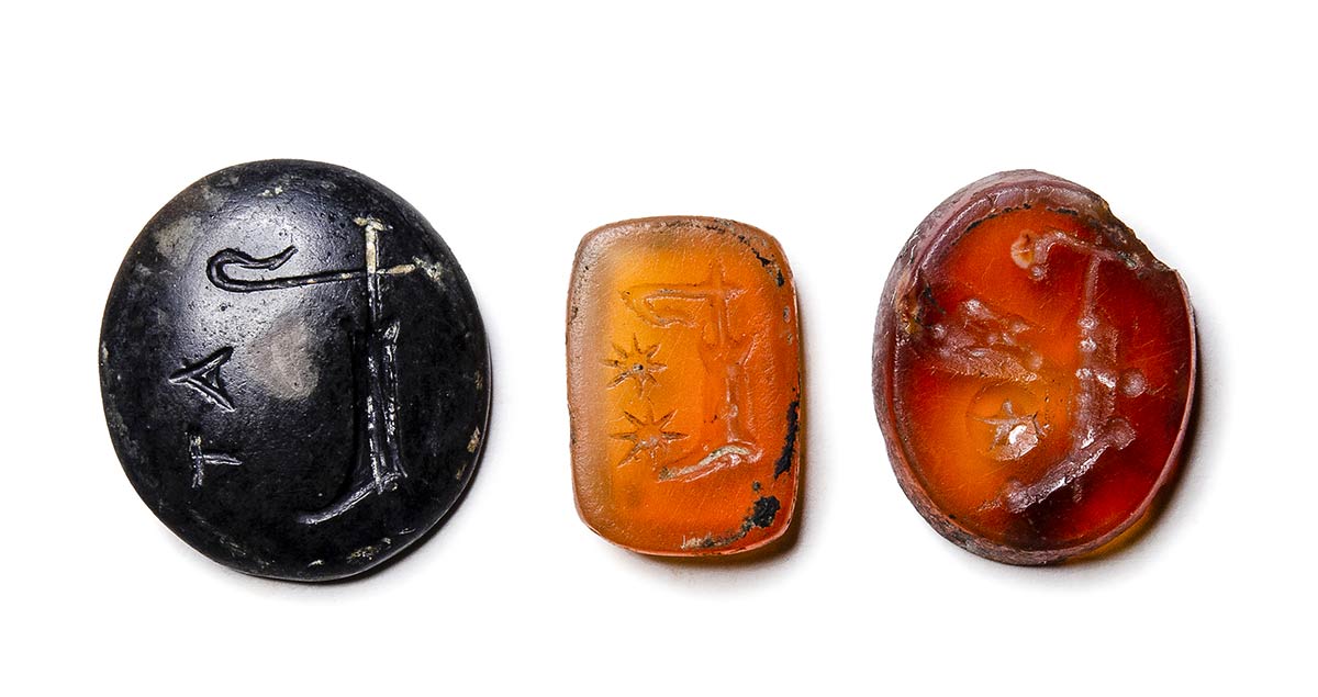 A group of 3 late republican agate and carnelian intaglio. Apotropaic symbols.