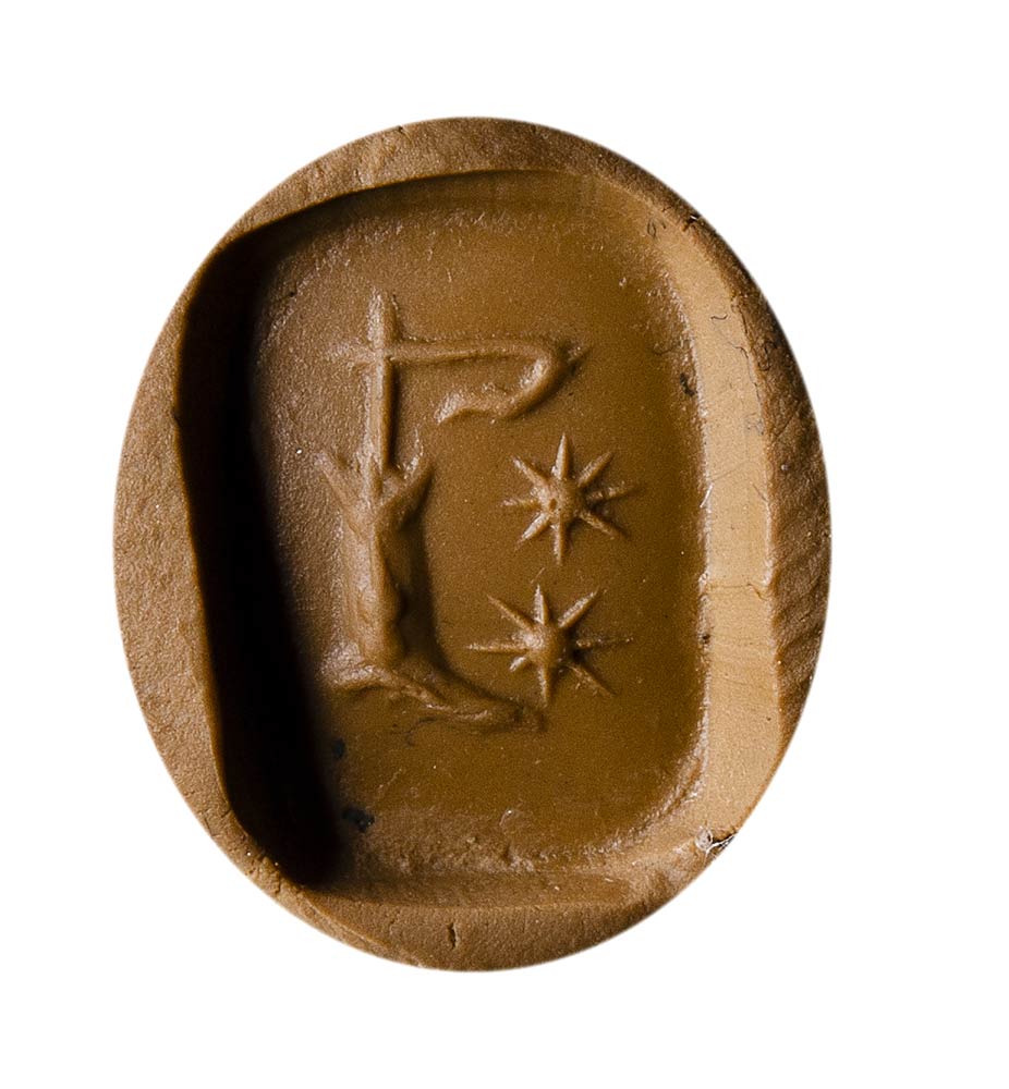 A rudder on the right, with two latin letters on the left « TA »; rudder with two star; rudder with a club and globe. Symbols of Tyche and good luck for travelers.