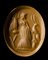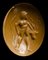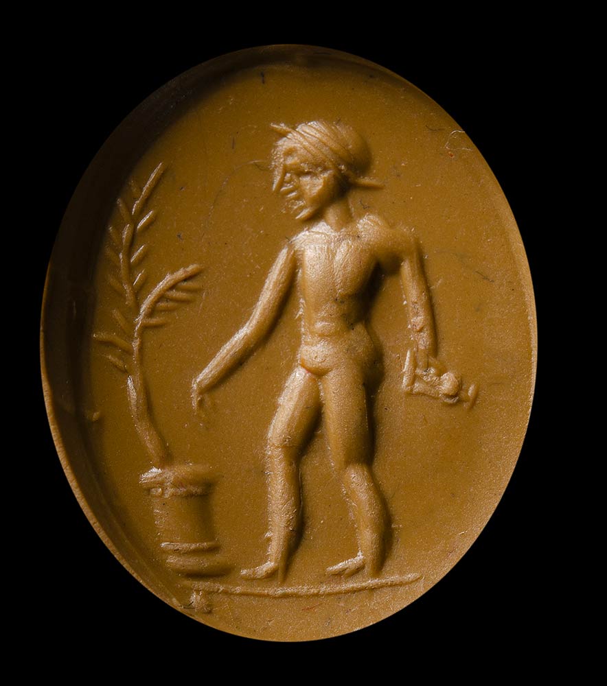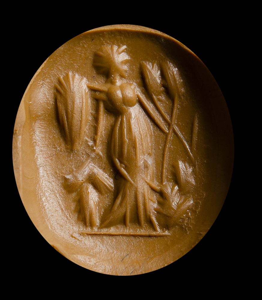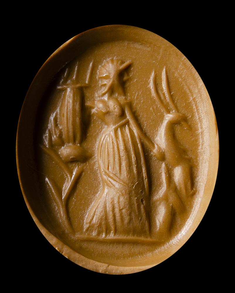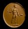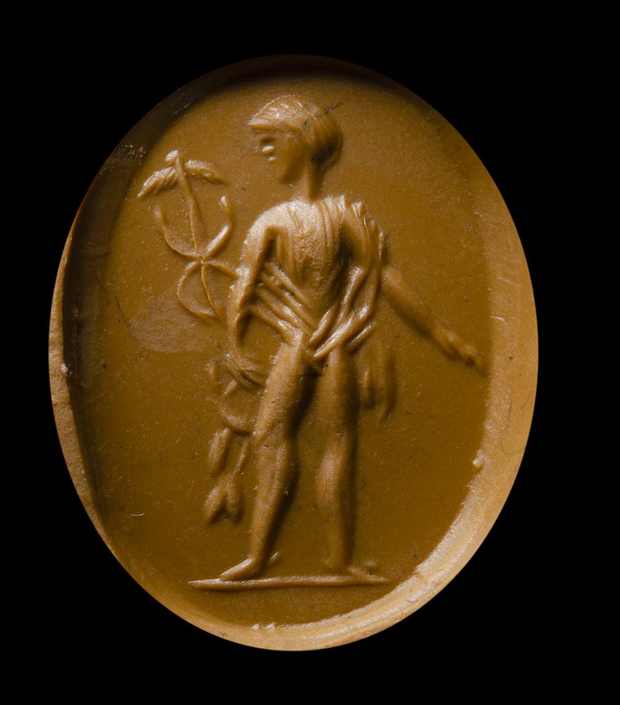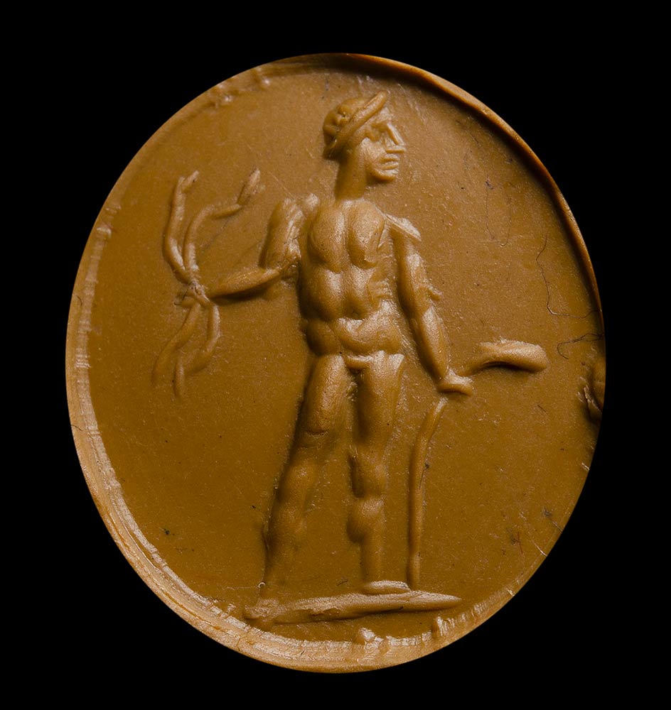 From left to right; An allegorical figure with two snakes in hand ; a pantheistic goddess standing and facing left; a male figure standing facing right, holding an oinochoe in his hand; Mercury standing with his attributes; an allegorical figure with attributes; hunter with deer. Wear marks.
