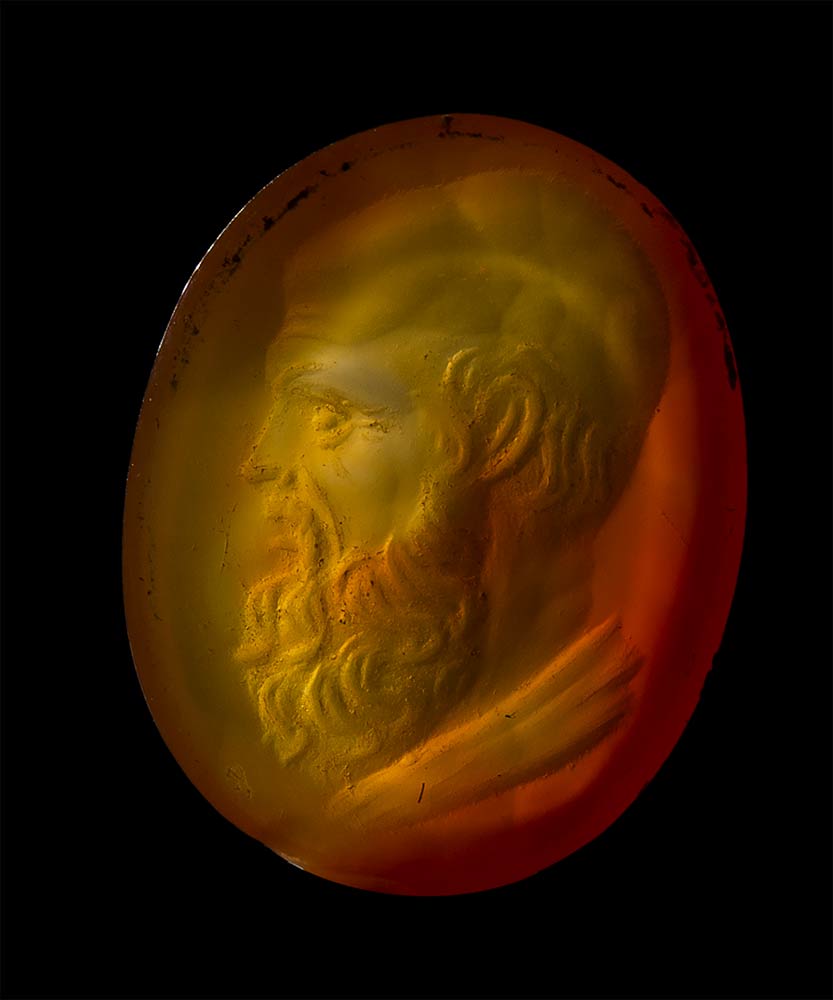 The hold character is facing left, characterized by a thick beard and bold head. This depiction is referred to Socrates portraiture. This portrait is finely engraved on a nice variety of agate. Wear marks.