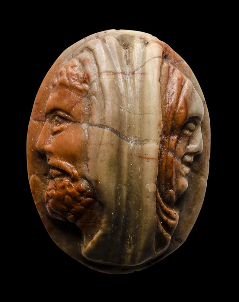 On the left, male bearded head, on the right, old woman head. Both joined by a folded veille covering the head. Interesting work and choice of the stone. Rare.