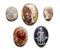 From left to right; a three-headed portrait (gryllos type); portrait of a veiled woman (priestress ?); portrait of a Youth; portrait of helmeted Minerva; traveller standing with a stick and his dog.