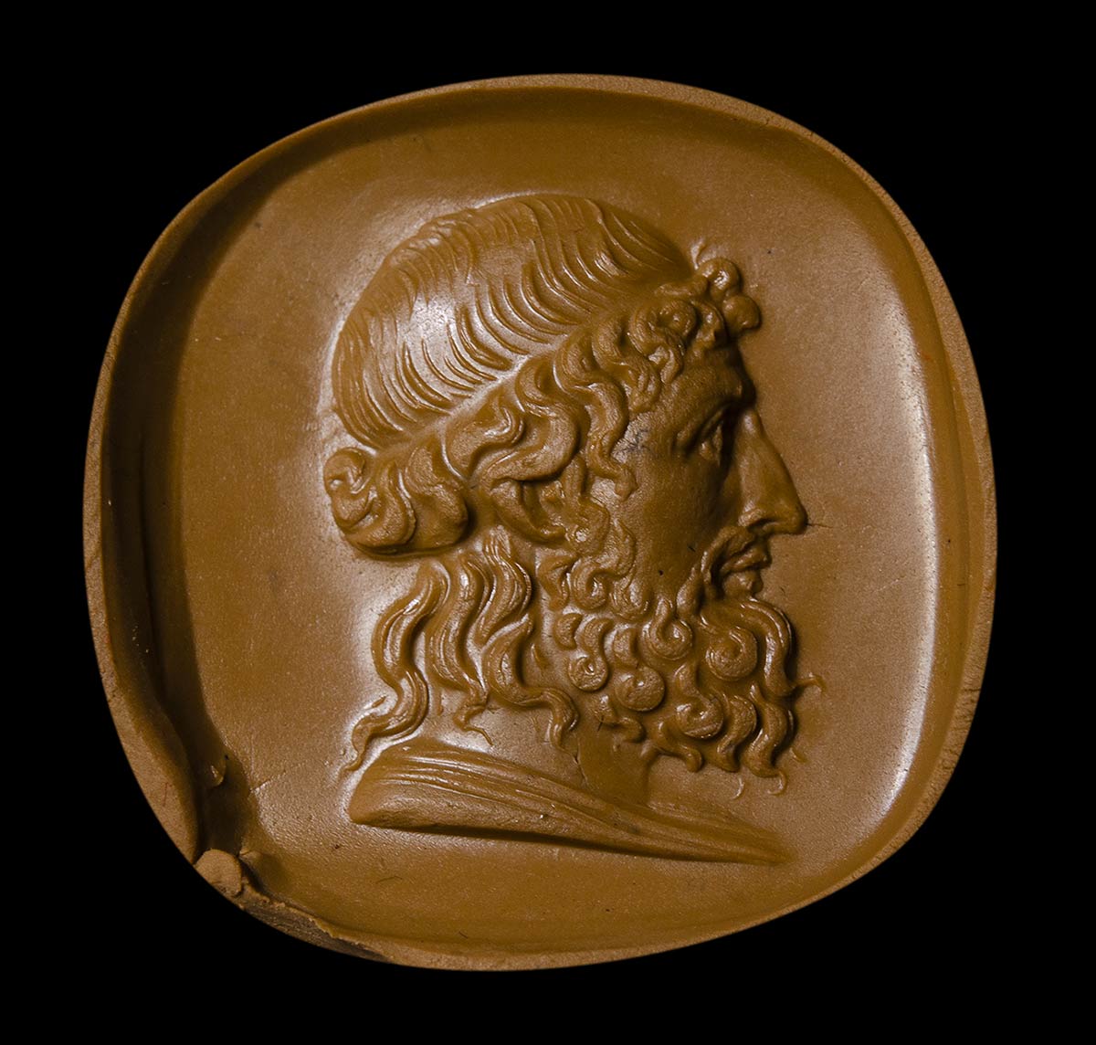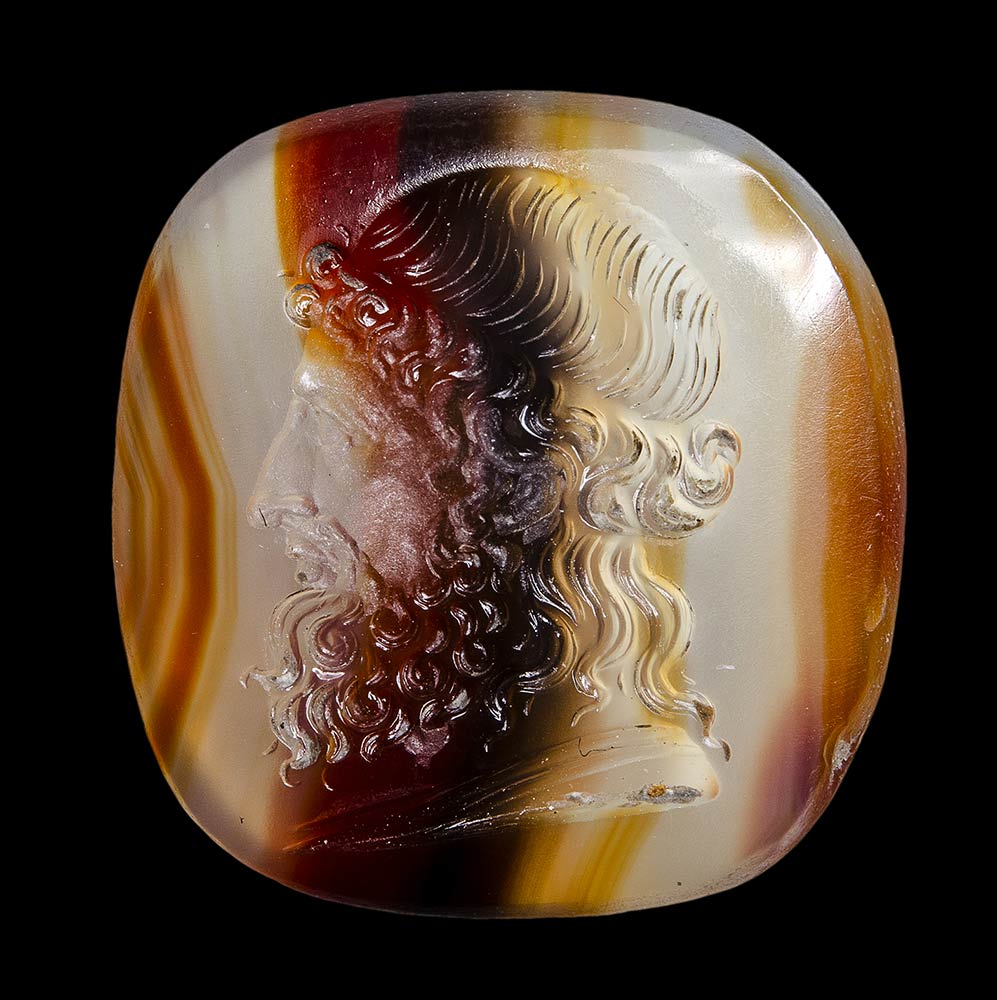 A neoclassical banded agate intaglio. Bust of Esculape.