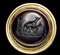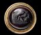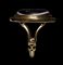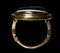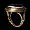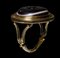 Rare and unusual representation of two dogs caught in the act of copulating. The two quadrupeds are facing right, inside an ancient Roman residence as symbolized by the presence of a three-footed candelabrum with a lamp on one side, and a jug on the other side. Ground line. The animals are characterized by a marked musculature well engraved in its anatomical details: the effort of the dog that mounts is also expressed by the arching of the vertebral column (whose bones can be seen) and of the thoracic cavity, together with the swelling of the muscles of the thighs and shoulders. His face is leaning upwards, as a sign of success, while the receiving dog is slightly bent forward. Both have the collar. Use of globular elements for the eyes. The carving is performed on a large three-layered sardonyx agate magic eye. The surface shows ancient signs of wear and in transparency also the signs of heat burn. The gem is set in an elegant 19th century gold ring. Grand Tour era. Rare subject.