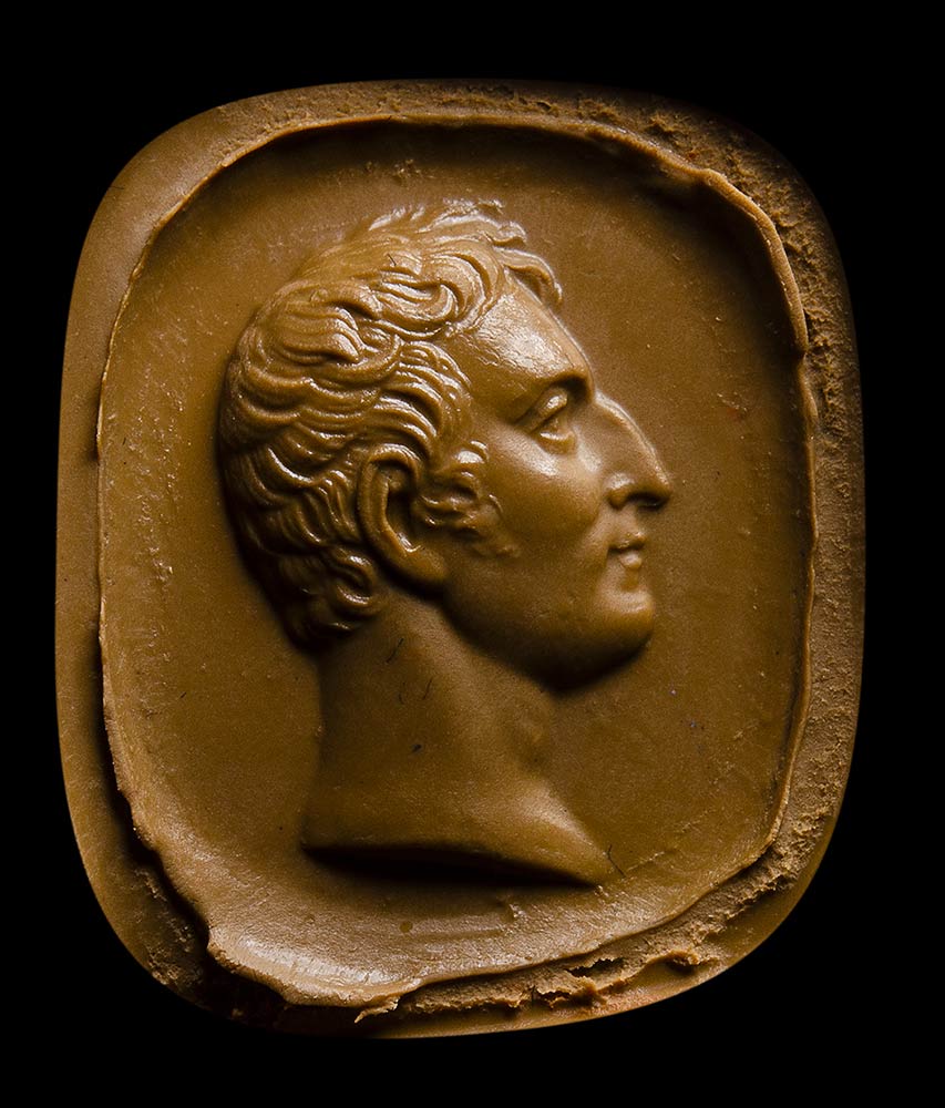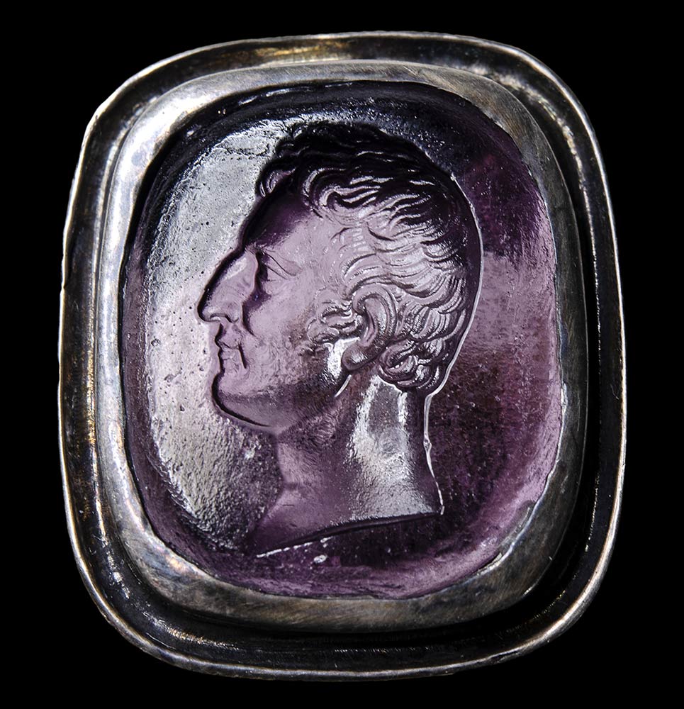The portrait of the famous general and english politician is facing left. Arthur Wellesley, 1st duke of Wellington (1769-1852) is mostly famous for his victory against Napoleon during the Waterloo Battle. The Tassie glass impression, of light amethyst colour is mounted in a silver ring with dark patina. Wear marks.