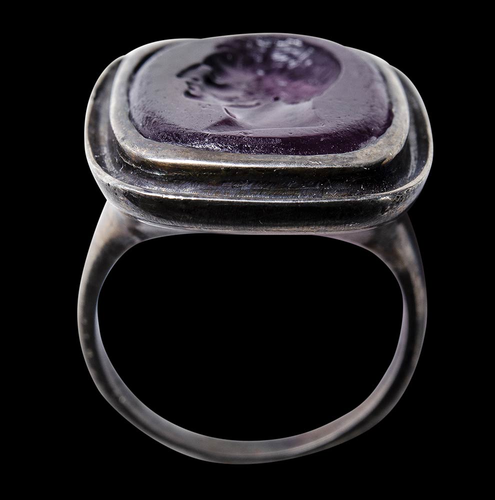 A silver ring set with a neoclassical Purple glass impression. Portrait of the Duke of Wellington.