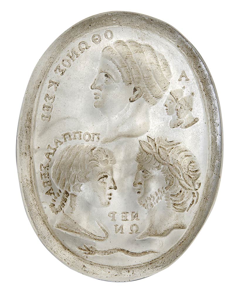 Rare impression with portraits of Neron, Oton, and Poppea from a carnelian intaglio (Hermitage museum, Saint Petersburg, collection of Catherine II, prev. Orleans, inv. 4414 Cabinet d’Orléans, 1786) with greek inscriptions, bust of Dioscures and snake. Transparent glass. Wear marks.