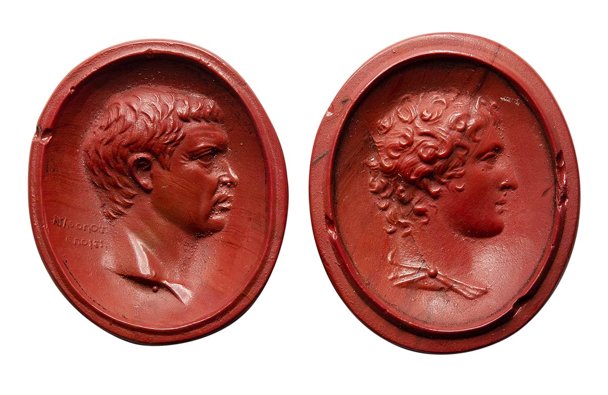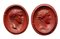 Two male portraits, facing right, inspired by graeco-roman models. The first is an effigy of a roman character, signed in greek; the second is a draped bust of Apollo. Glassy paste imitating red jasper. Impressions taken from intaglios. Grand Tour era.