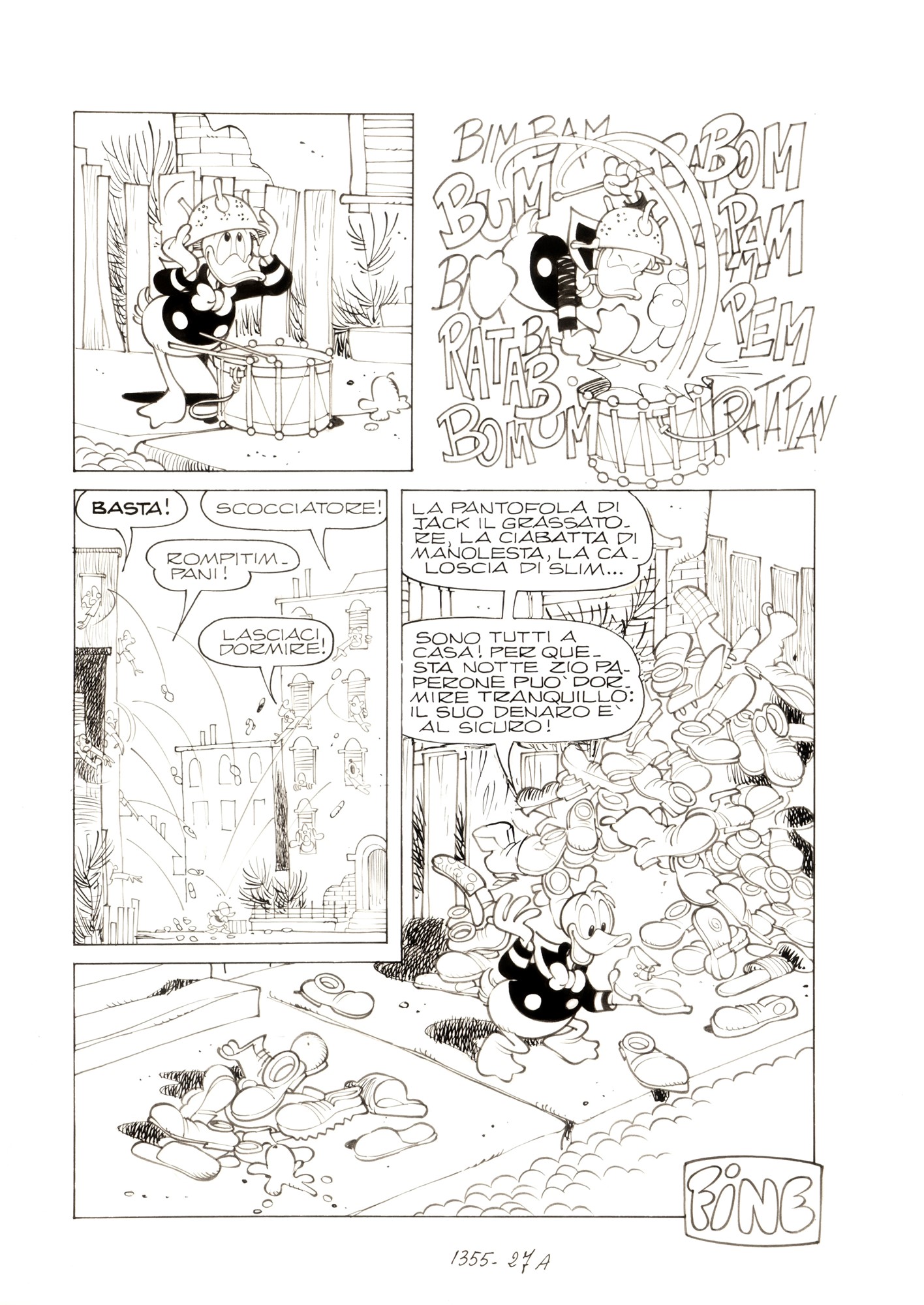 Tavola originale realizzata da Cavazzano per "Paperino aspirante supereroe", edita su Topolino n. 1355 a pag. 25 nel Novembre 1981. Paperino, dopo aver letto alcuni fumetti dei nipotini, decide di assumere l'identità di PaperBat e combattere il crimine, l'idea fu del grande Carlo Chendi che la propose per la prima volta nel 1965, ben prima della nascita di Paperinik, ma per alcune somiglianze con una storia di Barks l'allora direttore di Topolino Mario Gentilini decise di scartarla. Solo nel 1981 con l'arrivo del nuovo direttore finalmente questa avventura vide la luce, PaperBat sarebbe stato a tutti gli effetti il primo vero supereroe Disney. Tra le più iconiche avventure di Paperino.