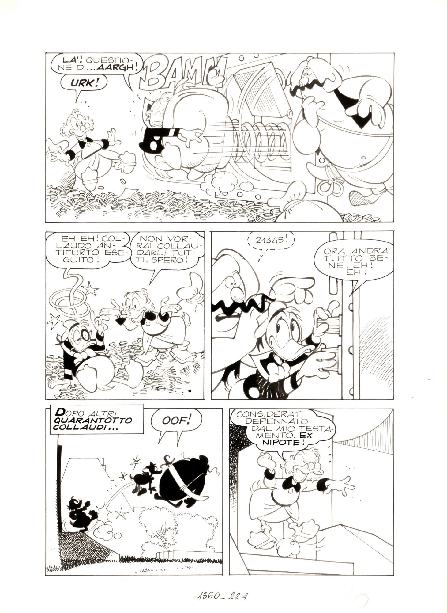 Tavola originale realizzata da Cavazzano per "Paperino e il genio maldestro", edita su Topolino n. 1360 a pag. 20 nel Dicembre 1981. Un genio della lampada a dir poco maldestro viene allontanato dal suo ultimo padrone ormai esasperato dai suoi continui errori, il genio sceglie Paperino come suo nuovo padrone...ne combinerà ovviamente di tutti i colori.