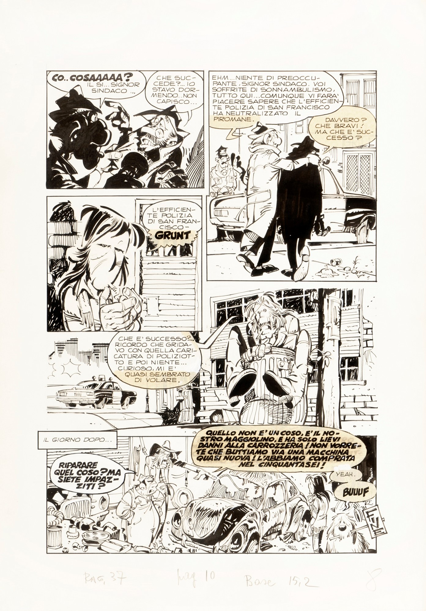 Tavola originale realizzata da Cavazzano per la pag. 8 di "Il piromane", episodio della mitica serie Altai & Jonson pubblicato sul CdR n. 37 nel 1976. Nati nel 1975 dal fervido genio di Tiziano Sclavi e dal magistrale pennello di Giorgio Cavazzano, Altai & Jonson sono la parodia dei vari Starsky e Hutch dei film e telefilm polizieschi americani che spopolavano negli anni'70, diventando presto un titolo di culto tra gli amanti del genere. « Mi ricordo che Altai & Jonson era, per me e per Giorgio, il primo fumetto importante. Senza Altai & Jonson, senza Cavazzano, probabilmente Dylan Dog non sarebbe mai nato. » (Tiziano Sclavi) Di grande rarità.