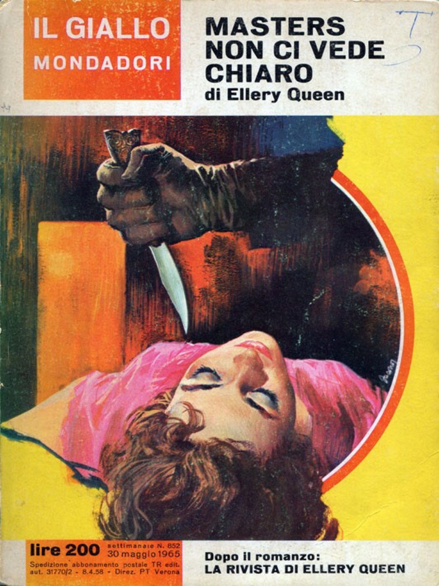 Originale di copertina realizzato da Jacono per il romanzo "Masters non ci vede chiaro" di Ellery Queen, edito nella collana Il Giallo Mondadori n. 852 dalla Mondadori nel 1965. Firmato.