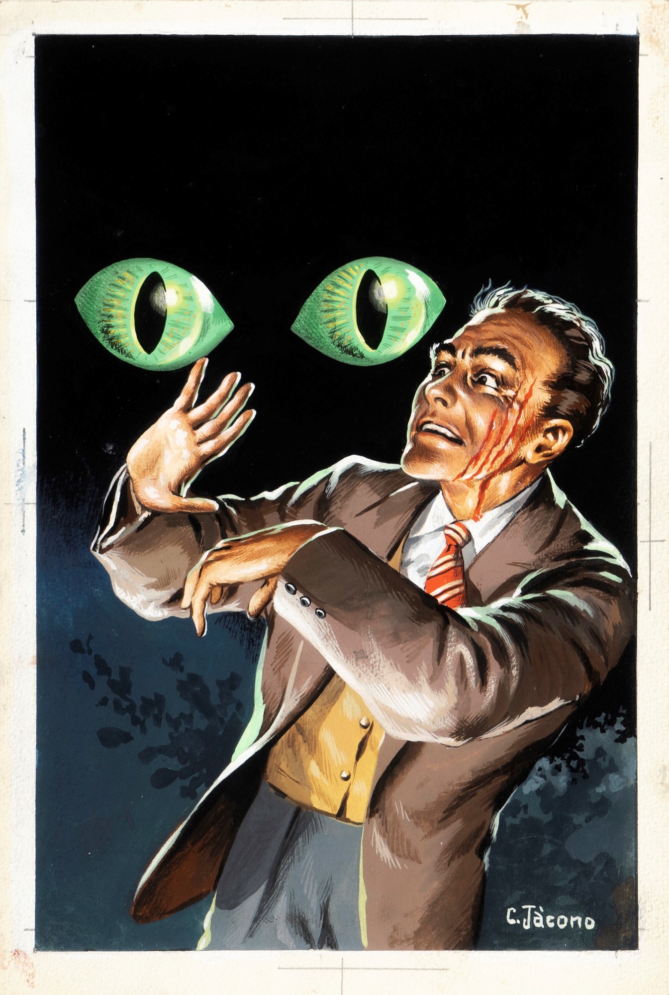 Originale di copertina realizzato da Jacono per il romanzo "Os Olhos Verdes" (The Green Eyes of Bast) di Sax Rohmer, edito nella collana Colecao Vampiro dalla casa editrice brasiliana Coluna Sociedade Editora nel 1952. Firmato.