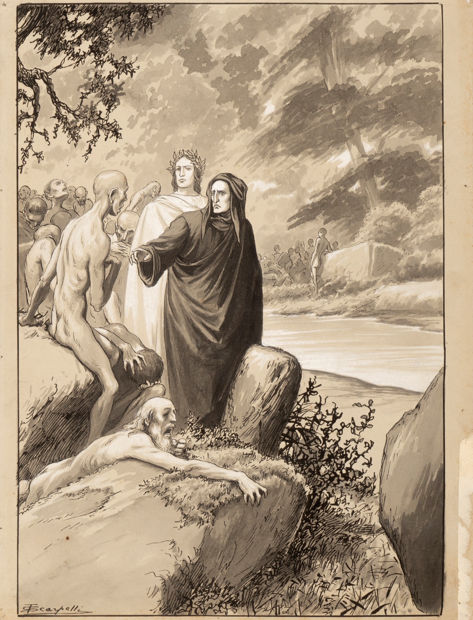 Illustrazione originale realizzata da Scarpelli per "La Divina Commedia", pubblicata a pagina intera nella prima cantica dell’Inferno da Nerbini nel 1908. Firmata.