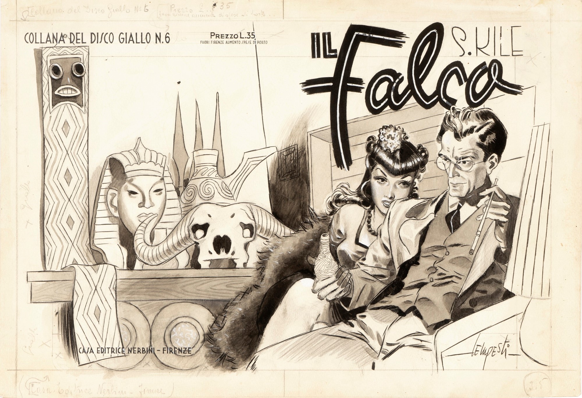 Originale di copertina (e quarta di copertina) realizzato da Tempesti per il romanzo Il Falco" di Sefton Kile, edito nella collana Romanzi del disco giallo n. 6 dalla Nerbini nel 1946. Lievi pieghe al margine superiore. Firmato.
