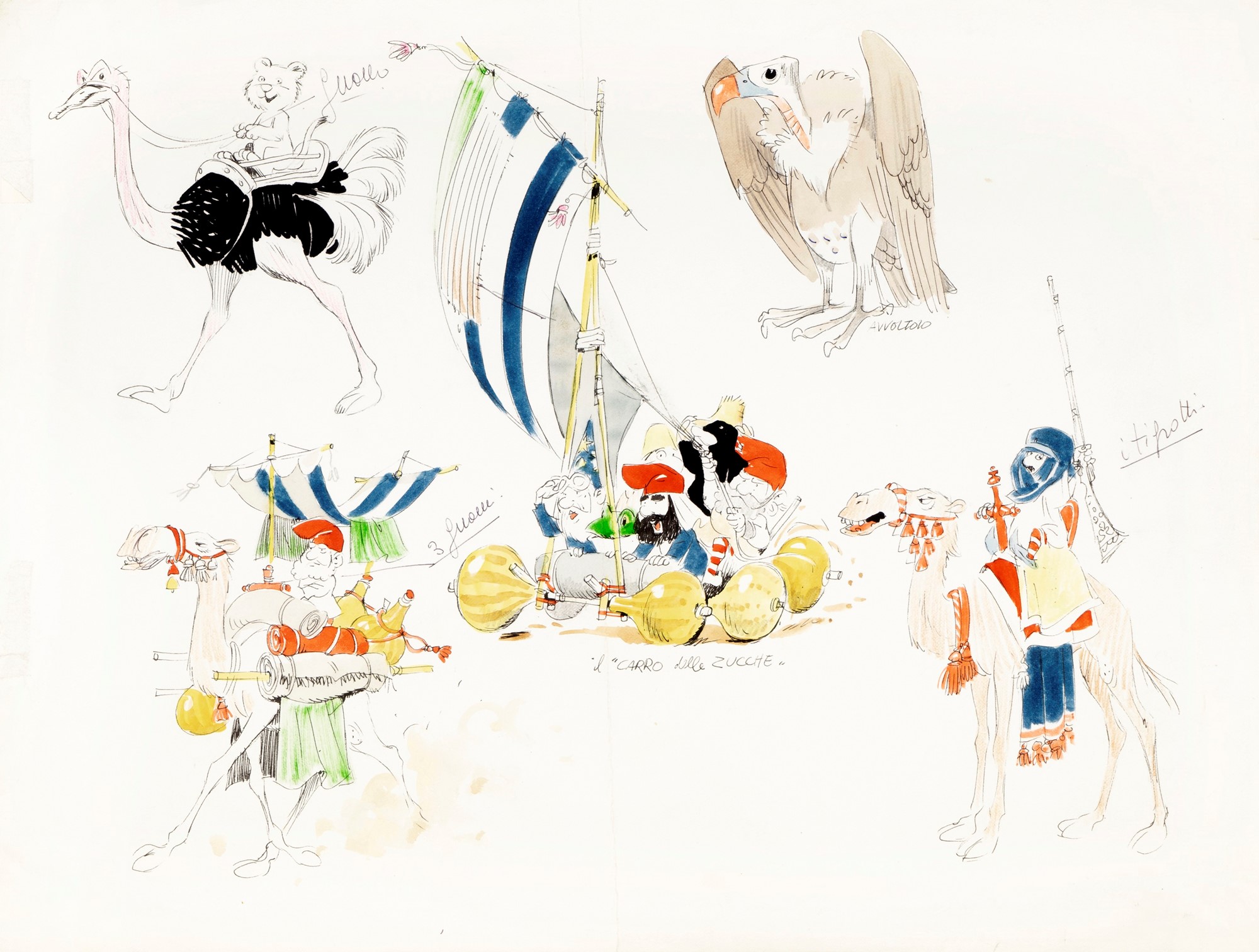Disegno originale realizzato da Lupatelli per lo studio dei personaggi del celebre volume "Il Grande Libro delle Meraviglie: Uno straordinario viaggio", edito per la prima volta dalle Edizioni Dami nel 1985. Tra i lavori più amati dallo stesso Lupatelli che definiva così quest'opera: "Uno dei miei libri più significativi. Si tratta di una derivazione delle storie del bosco, molti personaggi sono i medesimi, a cominciare dagli immancabili gnomi: il protagonista è Merlinus, uno gnomo mago accompagnato da una curiosa combriccola composta da altri due gnomi (Genius e Vulcanus), la tartaruga Lola, la talpa Talpa e il ranocchio Teo; la compagnia parte per un viaggio a bordo del dirigibile Felicione alla ricerca dell'acqua delle felicità. " Piega verticale al centro.