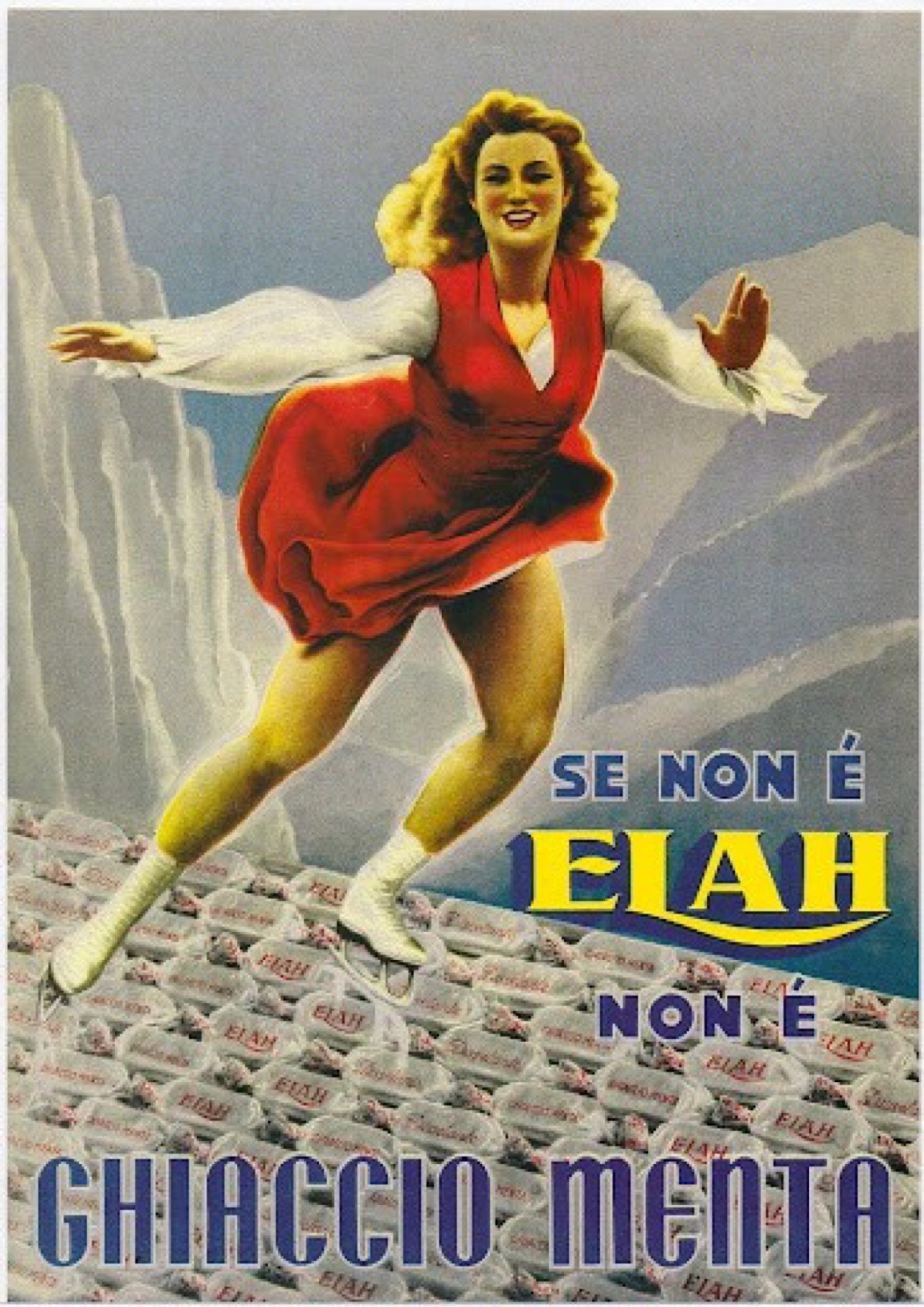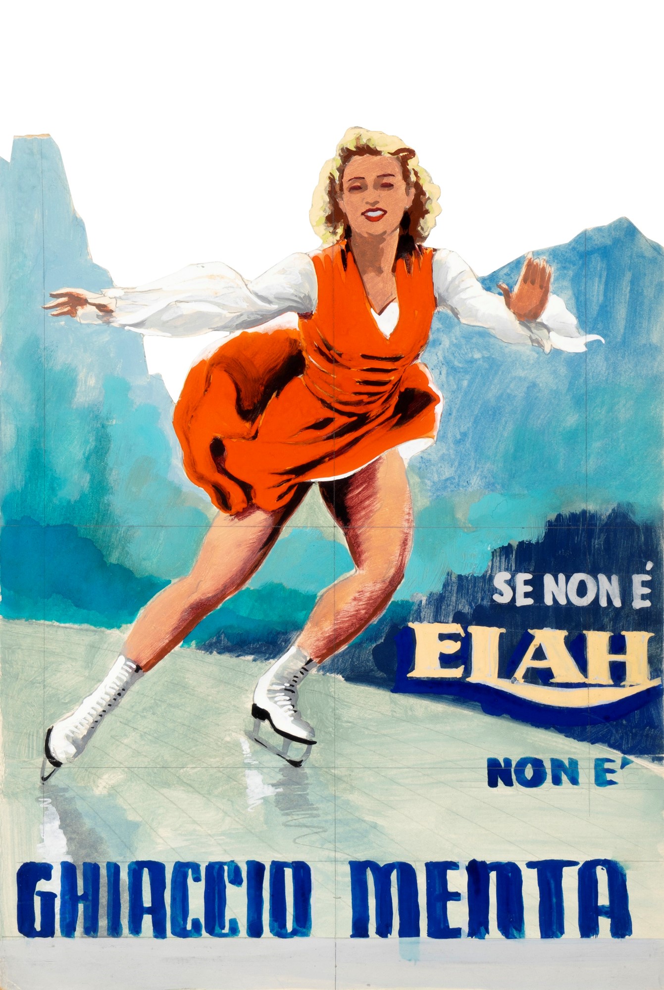 Bozzetto originale realizzato da Zucchi durante gli anni '40 per una locandina pubblicitaria del Ghiaccio Menta Elah. Piega orizzontale.