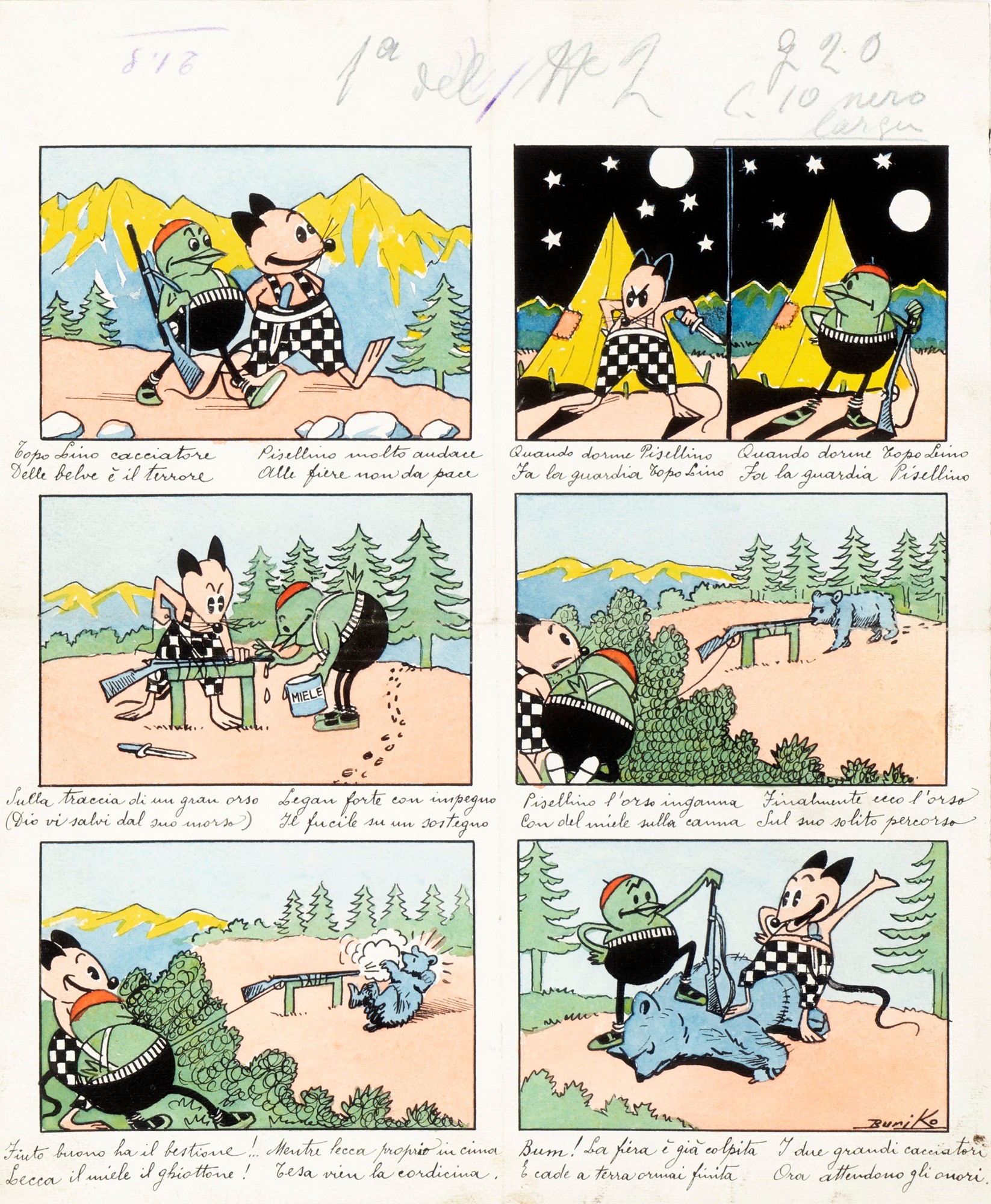 Tavola originale realizzata da Buriko per "Topo Lino", pubblicato poi come "Sorcettino", edita in copertina del mitico Topolino Giornale n. 6 dalla Nerbini il 4 Febbraio 1933. Nel Dicembre del 1932 la casa editrice Nerbini decise di dedicate un giornale per ragazzi al topo più famoso del mondo: il Topolino di Walt Disney, nato solo pochi anni prima negli USA e ormai molto famoso anche in Italia. Nerbini diede quindi il nome "Topolino" a questa nuova pubblicazione, decidendo però di ricreare in chiave italiana il Mickey Mouse di Floyd Gottfredson, incaricando l'artista di punta della casa editrice, Giove Toppi, di dare vita all'italico Topo Lino sulla falsa riga del cugino americano. A causa di problemi di copyright con la Disney, la Nerbini fu costretta per due numeri del giornale (il numero 3 e 4) a cambiare la testata in "Topo Lino", per poi tornare al normale "Topolino" dal numero 5 una volta appianate le divergenze legali. Grazie al ritrovamento di queste tre tavole originali di Buriko, in cui appare il lettering originale, scopriamo come Nerbini incaricò non solo Giove Toppi di creare una versione italiana di Mickey Mouse, ma anche Antonio Burattini (in arte Buriko) il quale propose all'editore fiorentino diverse tavole del suo Topo Lino; forse per la notorietà di Toppi la Nerbini decise di affidare a lui il personaggio, dando quindi al topo di Buriko il nome di "Sorcettino". Un pezzo da museo. Lieve piega verticale e orizzontale al centro. Firmata.