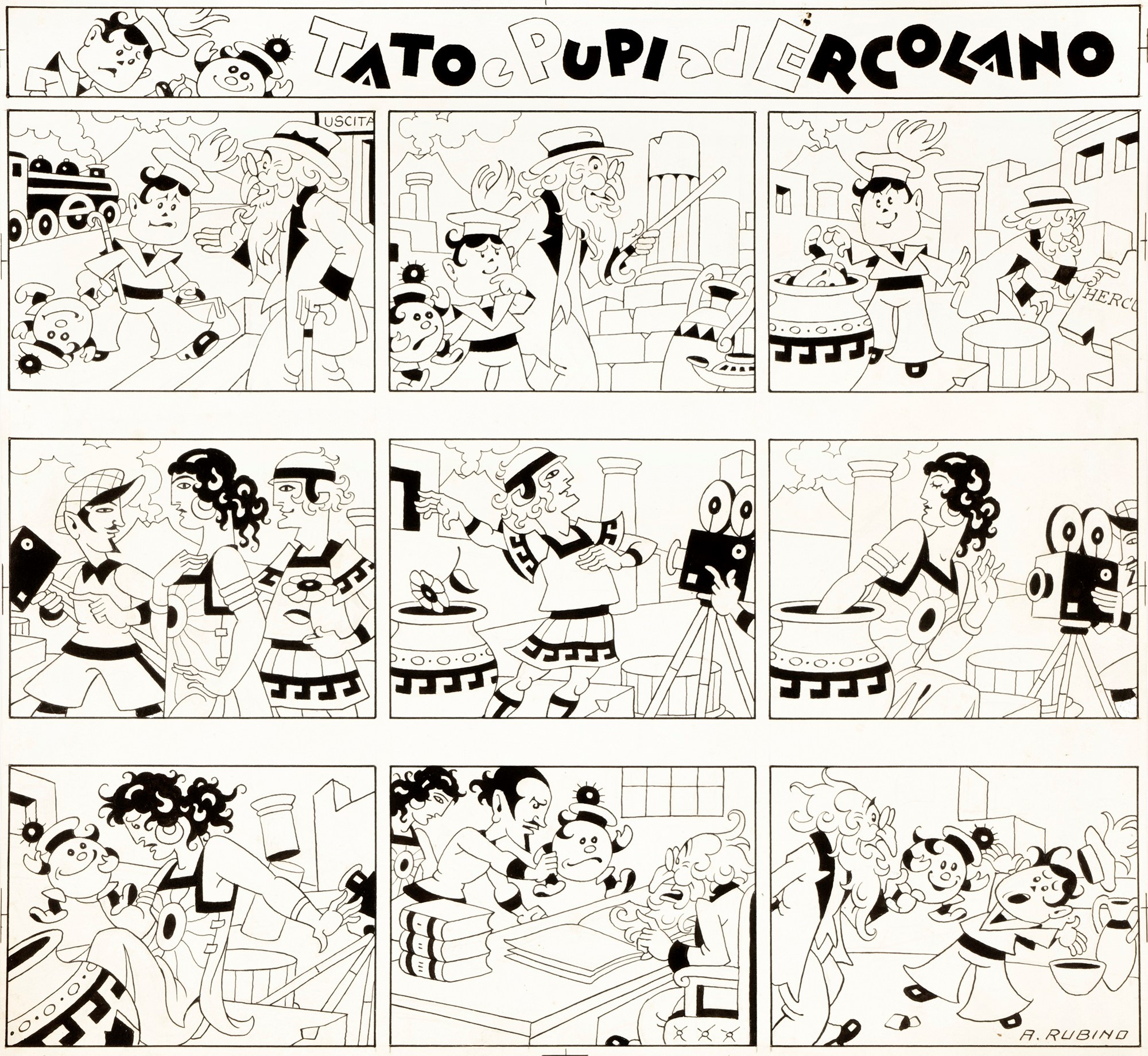 Tavola originale realizzata da Rubino intitolata "Tato e Pupi ad Ercolano", pubblicata sul quindicinale promozionale Mondo Bambino tra il 1930 e il 1931 dai Grandi Magazzini La Rinascente di Milano. Finita l'esperienza con il giornale di regime Il Balilla, Rubino nei successivi due anni (1930 e 1931) dedicherà tutto sè stesso a questo mitico periodico milanese destinato ai più piccoli, diventandone fondatore, direttore e redattore. Firmata.