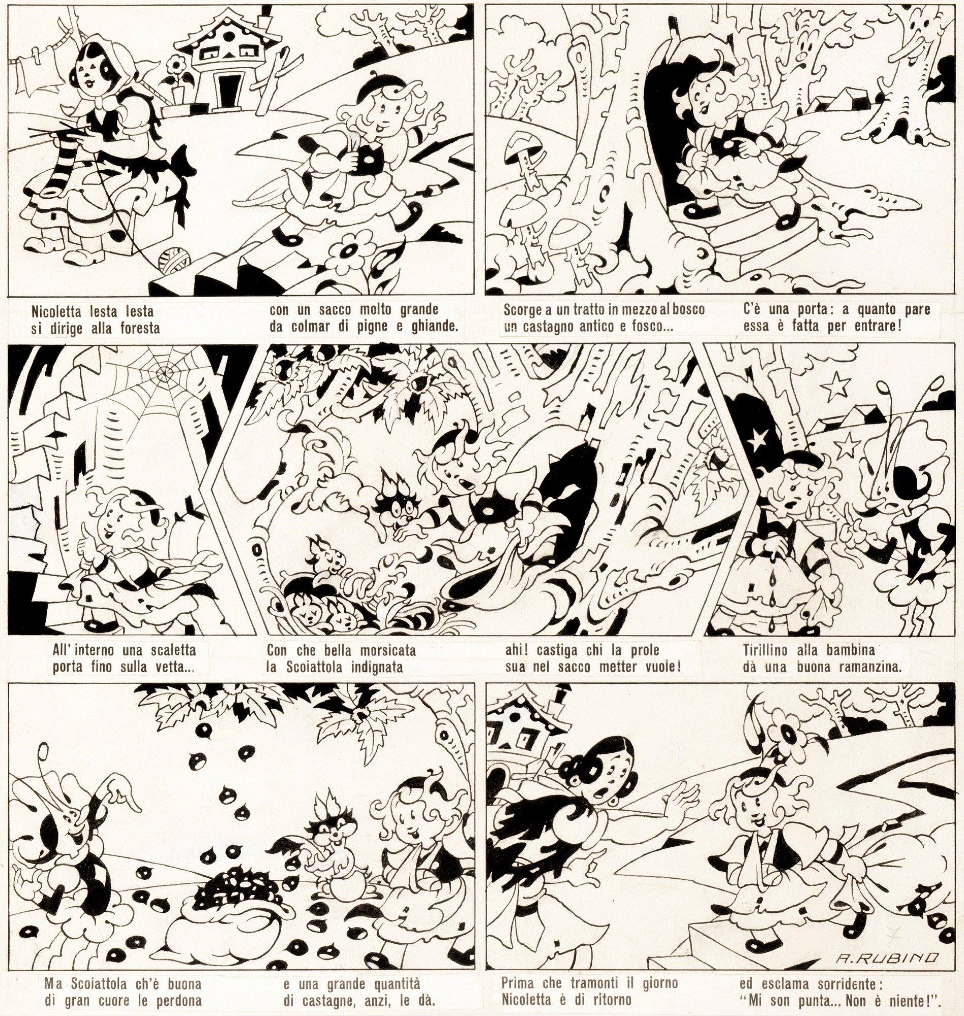 Tavola originale realizzata da Rubino per "Nicoletta", pubblicata sulle pagine del CdP tra il '31 e il '34, periodo in cui Rubino (rientrato dal suo periodo a Il Balilla) riprese a lavorare per la testata milanese. Le tavole di Nicoletta immergono il giovane lettore in boschi incantati, popolati da una fauna e una flora antropomorfa, dove è sempre presente il folletto Trillino. Lievi pieghe orizzontali tra le vignette. Firmata.