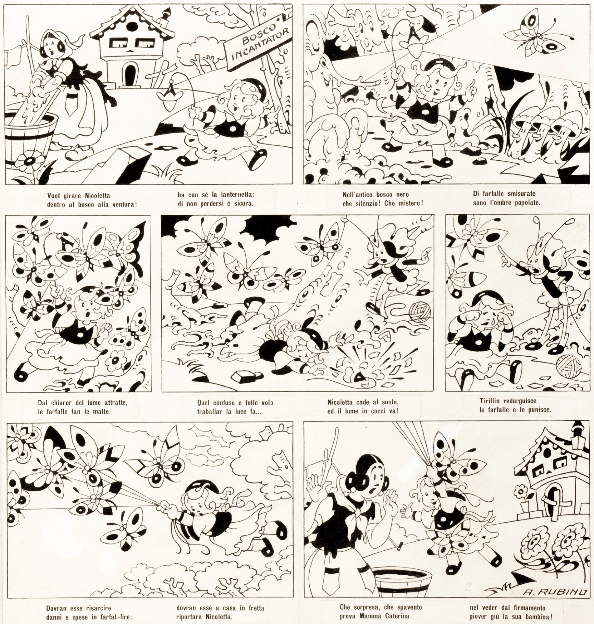 Tavola originale realizzata da Rubino per "Nicoletta", pubblicata sulle pagine del CdP tra il '31 e il '34, periodo in cui Rubino (rientrato dal suo periodo a Il Balilla) riprese a lavorare per la testata milanese. Le tavole di Nicoletta immergono il giovane lettore in boschi incantati, popolati da una fauna e una flora antropomorfa, dove è sempre presente il folletto Trillino. Lievi pieghe orizzontali tra le vignette. Firmata.