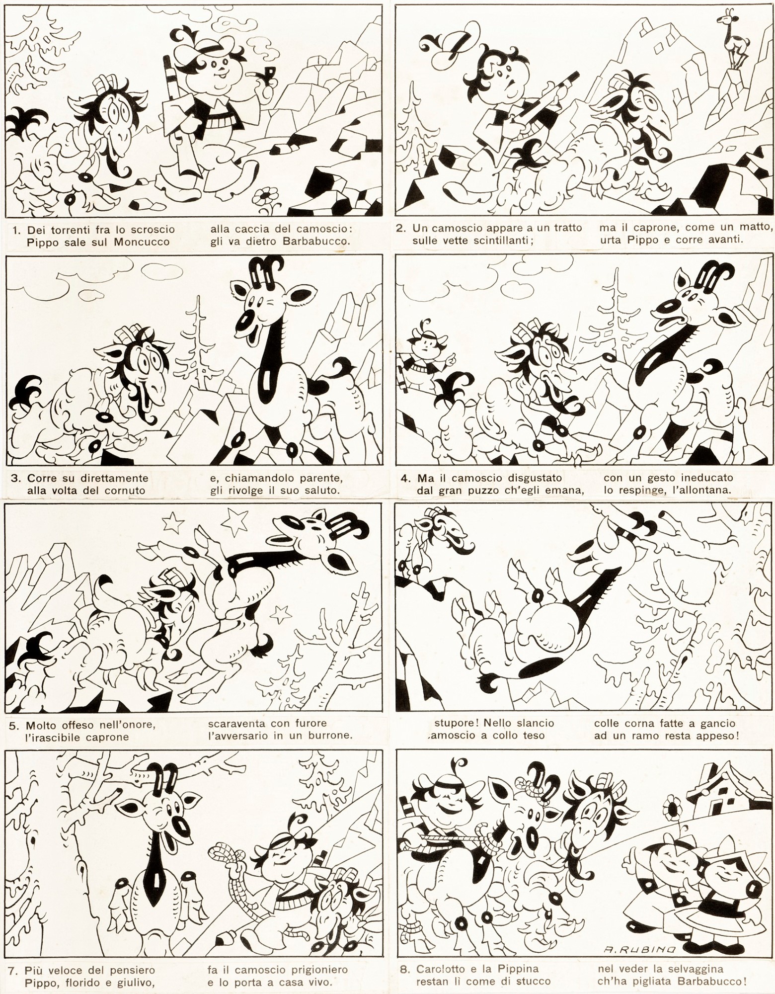 Tavola originale realizzata da Rubino per "Pippotto e Barbabucco", il piccolo Pippotto e il caprone Barbabucco apparvero sulle pagine del CdP a partire dal 20 marzo 1910 ed entrano a pieno titolo tra le maschere più iconiche del genio di San Remo. Rubino (rientrato dal suo periodo a Il Balilla) riprese il personaggio dal '31 al '34 quando lascerà definitivamente il giornale milanese. Su due pannelli. Piega verticale al centro. Firmata.