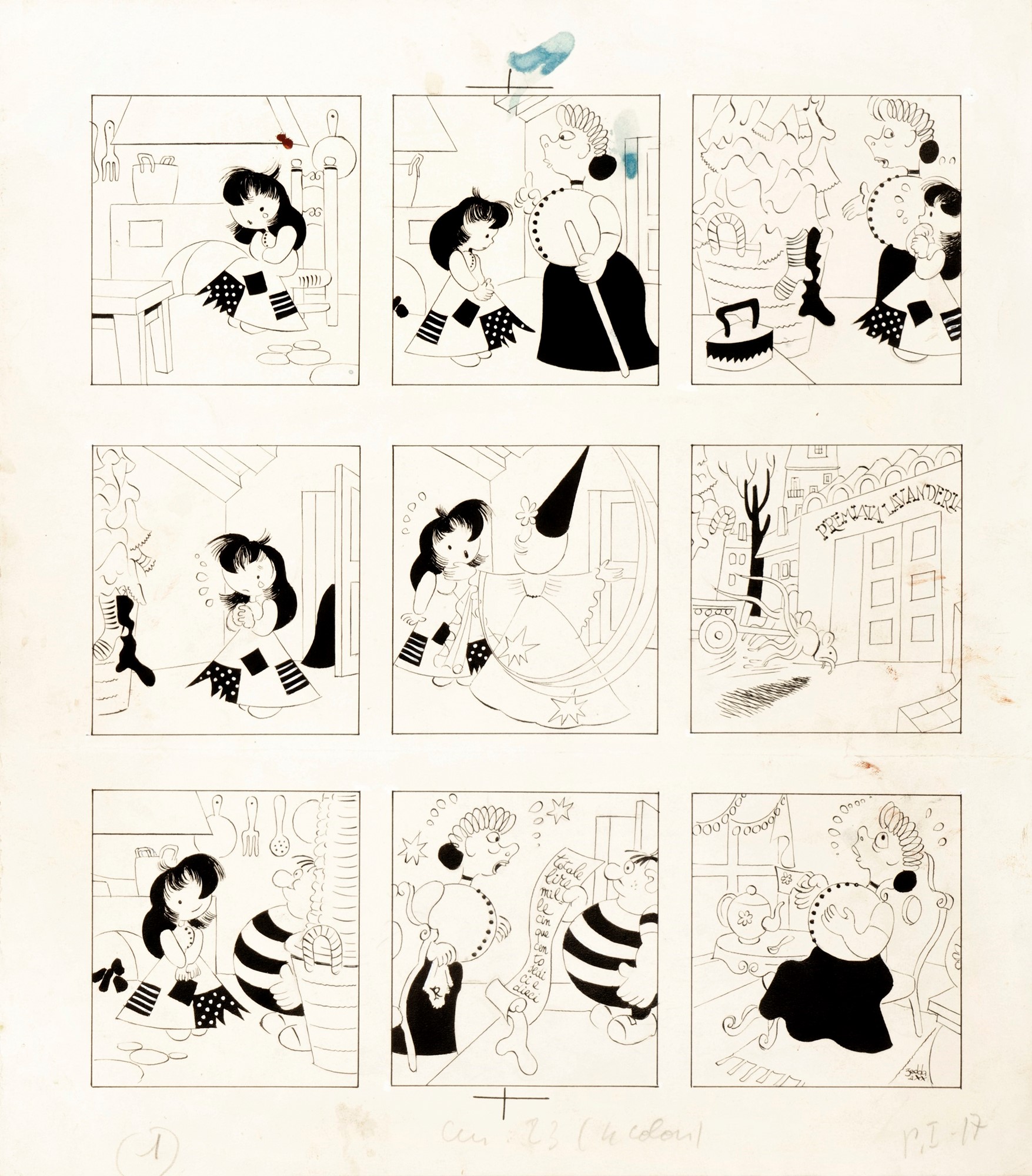 Tavola originale realizzata da Zedda per un episodio della sua "Carolina", edita sulle pagine del giornale Il Balilla nel 1942. Lieve piega orizzontale. Acquerellata al retro. Firmata e datata.