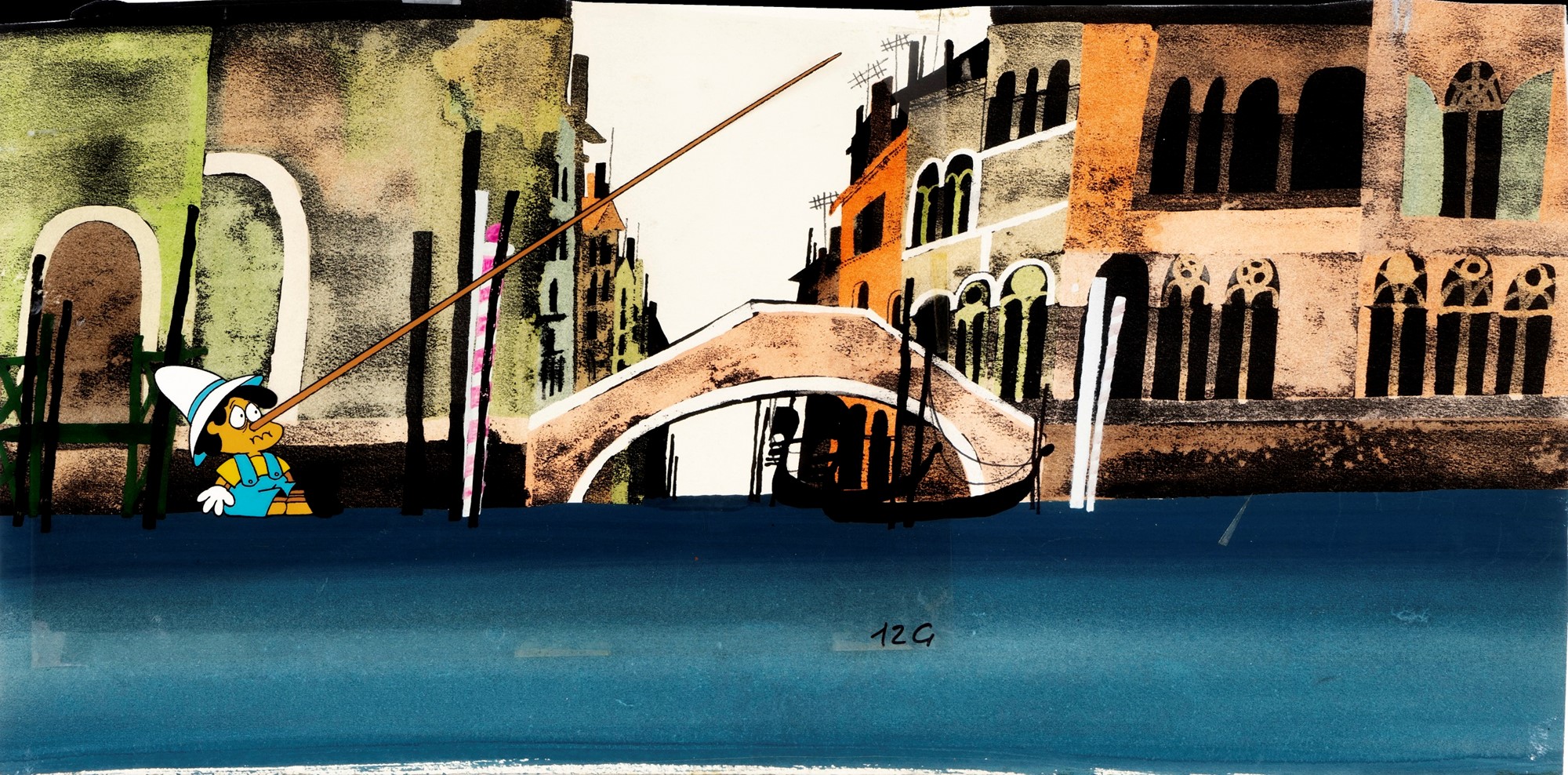 Cel originale su fondale dipinto realizzato dallo Studio Bozzetto in due occasioni distinte: il fondale fu utilizzato nel cortometraggio "Il signor Rossi a Venezia" del 1974, la cel con Pinocchio invece appare nel lungometraggio "I sogni del signor Rossi" del 1977. Bozzetto decise di unire queste due opere per omaggiare il Pinocchio di Collodi in occasione della mostra "Pinocchio graphis: un naso lungo duecento disegni inediti" tenutasi a Venezia nel 1986, l'opera è pubblicata sull´omonimo catalogo edito dall´Editrice Montagna nel 1987.