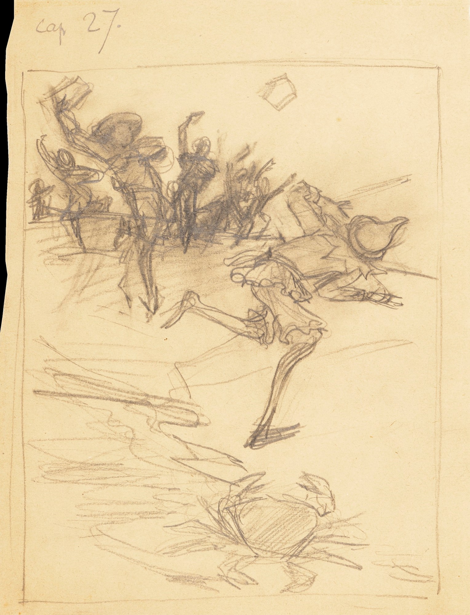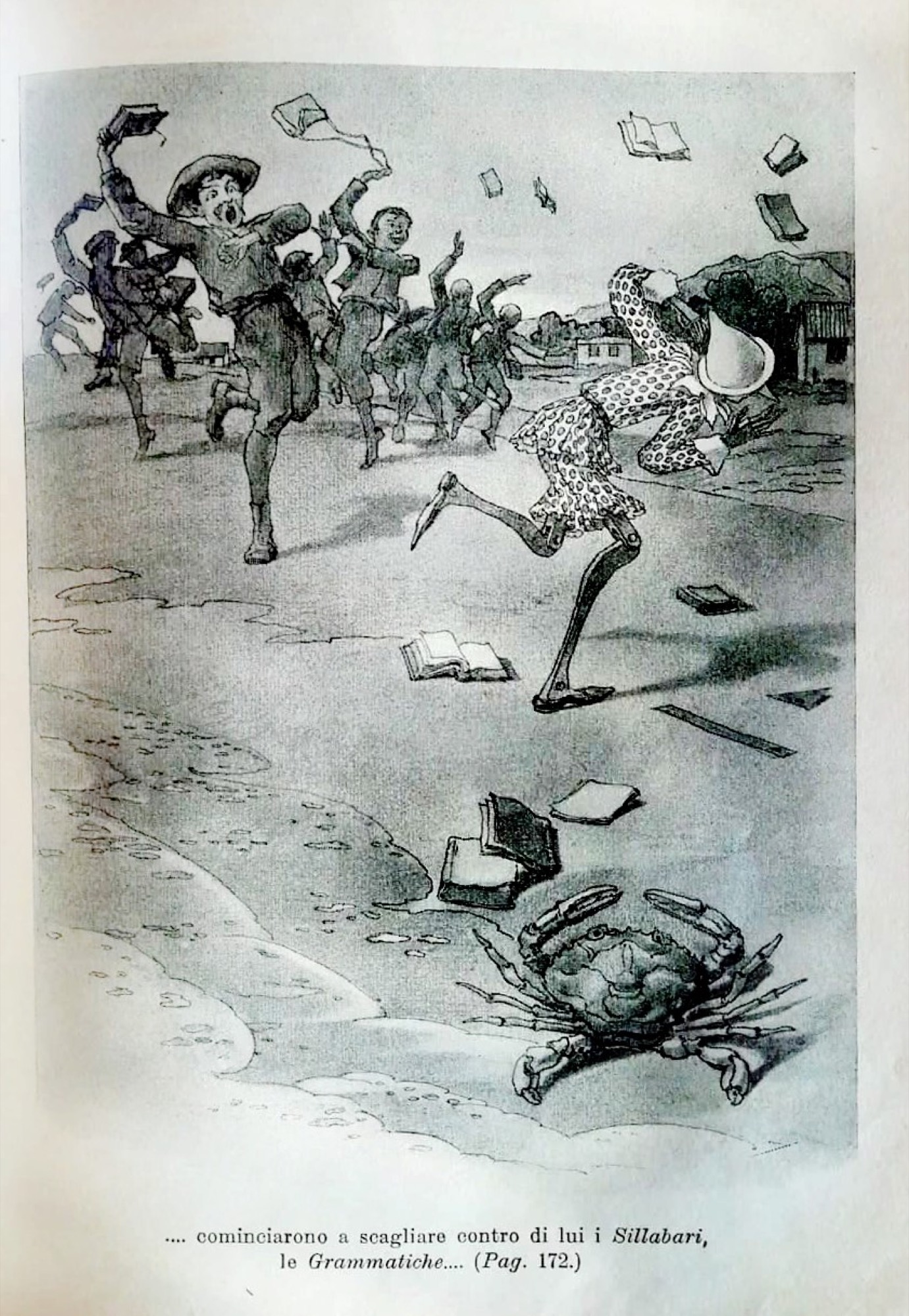 Studio preliminare realizzato dai Cavalieri (padre e figlia) per l'illustrazione di pag. 172 della loro celebre edizione del "Pinocchio" edito da Salani nel 1924. Raffigurata la scena del " Gran combattimento fra Pinocchio e i suoi compagni " presente nel capitolo XXVII. Di grande rarità i disegni per questa edizione del classico collodiano.
