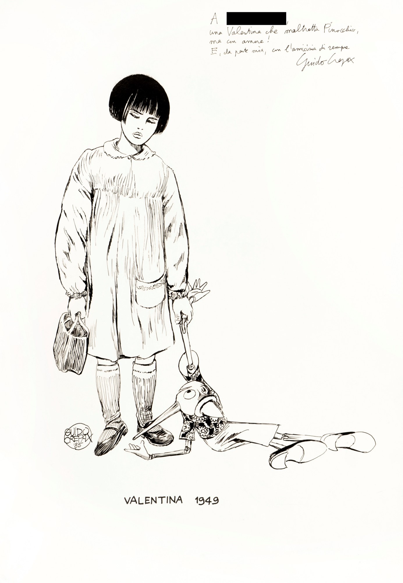 Illustrazione originale realizzata da Crepax in occasione della mostra "Pinocchio graphis: un naso lungo duecento disegni inediti", tenutasi a Venezia nel 1986, pubblicata sull´omonimo catalogo edito dall´Editrice Montagna nel 1987. Splendido omaggio del maestro milanese che vede la sua piccola Valentina all'età di soli 7 anni (Valentina nasce il giorno di Natale del 1942 come la moglie di Crepax) insieme ad un Pinocchio apparentemente inanimato. Firmata, titolata, datata e dedicata.