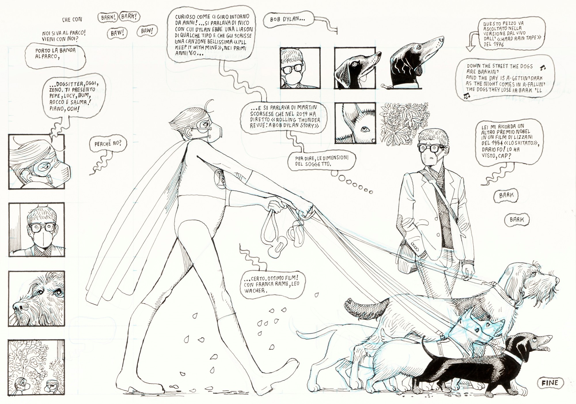 Tavola originale realizzata da Bacilieri per "Desolation Row", pag. 2 di questa storia breve dedicata a Bob Dylan pubblicata sulla rivista Linus nel 2021.