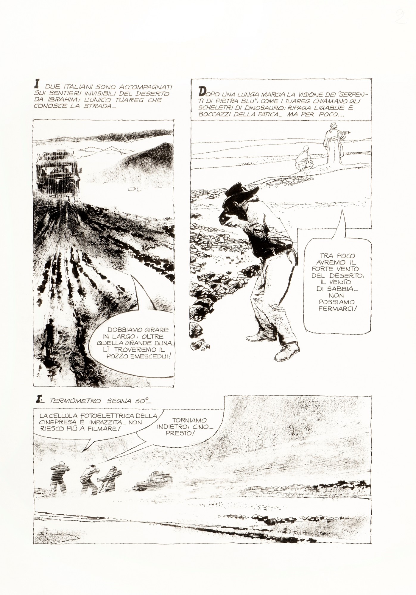 Tavola originale realizzata da Battaglia per "I serpenti di pietra blu", edita per la prima volta sulle pagine del Messaggero dei Ragazzi n. 14 a pag. 2 nel 1973. Acquerellata al retro.